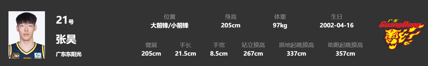别看张昊已经上了一队这么久,以为他已经是个老将了,实际上他是2002年出生的球员,今年也才23岁而已。张昊在硬件天赋这一块也是不错的,他的身高是205cm,臂展为205cm,网上所传的213cm的臂展都是假的,大家不要相信。
