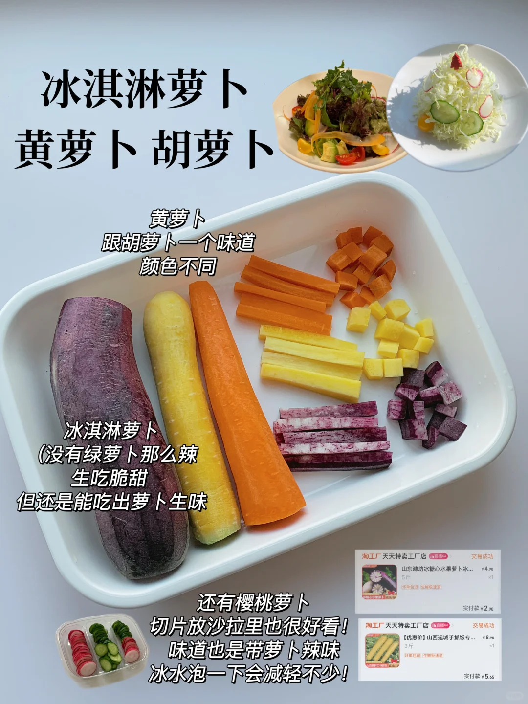 穷鬼打工人网购💰沙拉基底菜试吃! 沙拉蔬菜热量低,但有着不同的口感、营养价值和颜值搭配 那么沙拉基底菜到底怎么选?今天分享一些常见的沙拉基底菜真实试吃体验❗ 🔅本期沙拉蔬菜有: 苦苣、罗马生菜、奶油生菜、紫甘蓝、红菊苣、羽衣甘蓝、孢子甘蓝、彩椒、玉米笋、冰淇淋萝卜、黄萝卜、黄瓜、圣女果等 每种都可以生吃!随意选几种色彩搭配在一起也很好看!不知道大家喜欢搭配哪几种菜 沙拉汁也可以搭配任意你喜欢的,像焙煎芝麻沙拉汁、大拌菜汁等🥬 或者中式油醋汁:生抽+香醋+芝麻油+黑胡椒蒜泥盐糖等🫙 再配上自己喜欢的蛋白质:鸡蛋、牛肉、虾等🥩 就是一顿健康营养的美味沙拉减脂餐啦~🥗 而且沙拉菜啥的不仅热量低,比起点外卖花费也低 像很多果蔬肉蛋我都是在淘工厂买,真的很便宜! 产地直供,品质也靠谱!而且还有很多羊毛3元3件还包邮~主打一个该省省该花花! 注:生吃沙拉蔬菜口感不喜欢的话 可以试试冰水泡十分钟左右 能去除蔬菜的部分苦涩味/生味 口感吃起来也会更清爽哦~~(避免浪费)