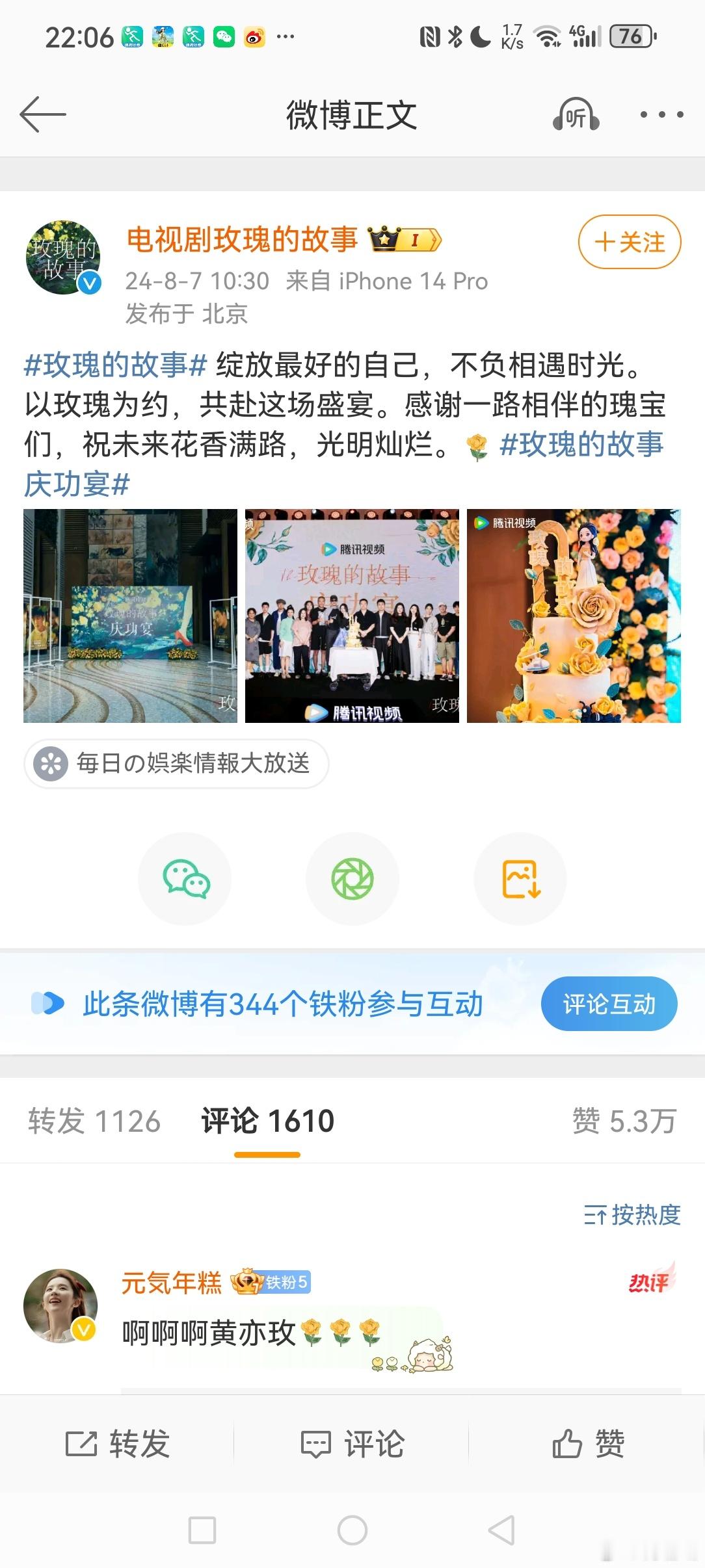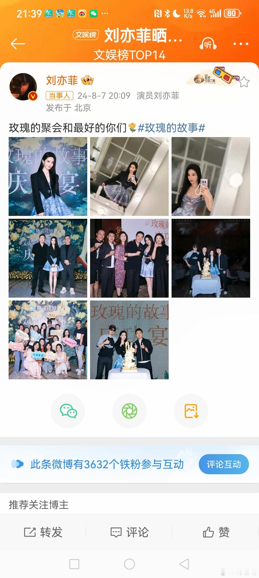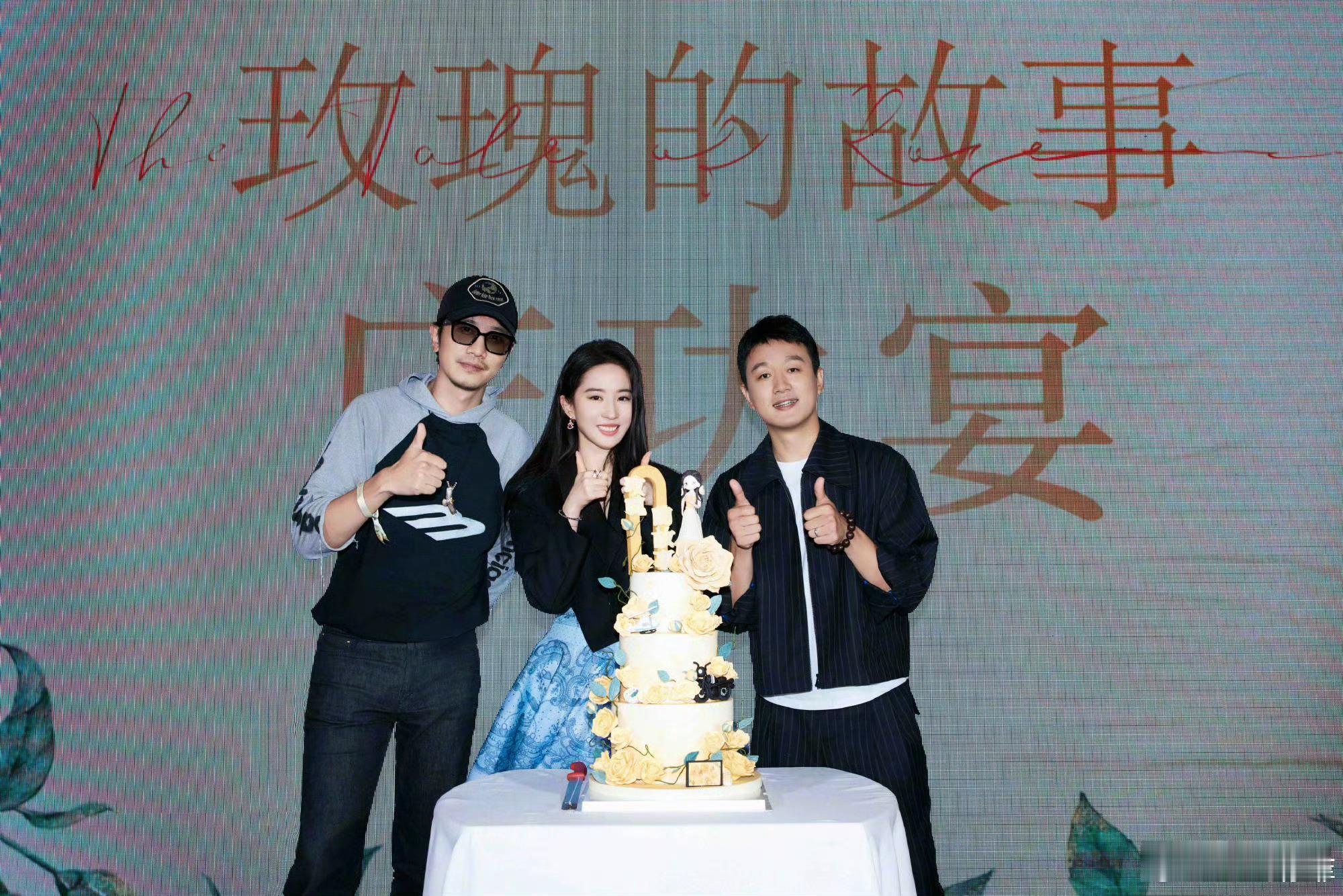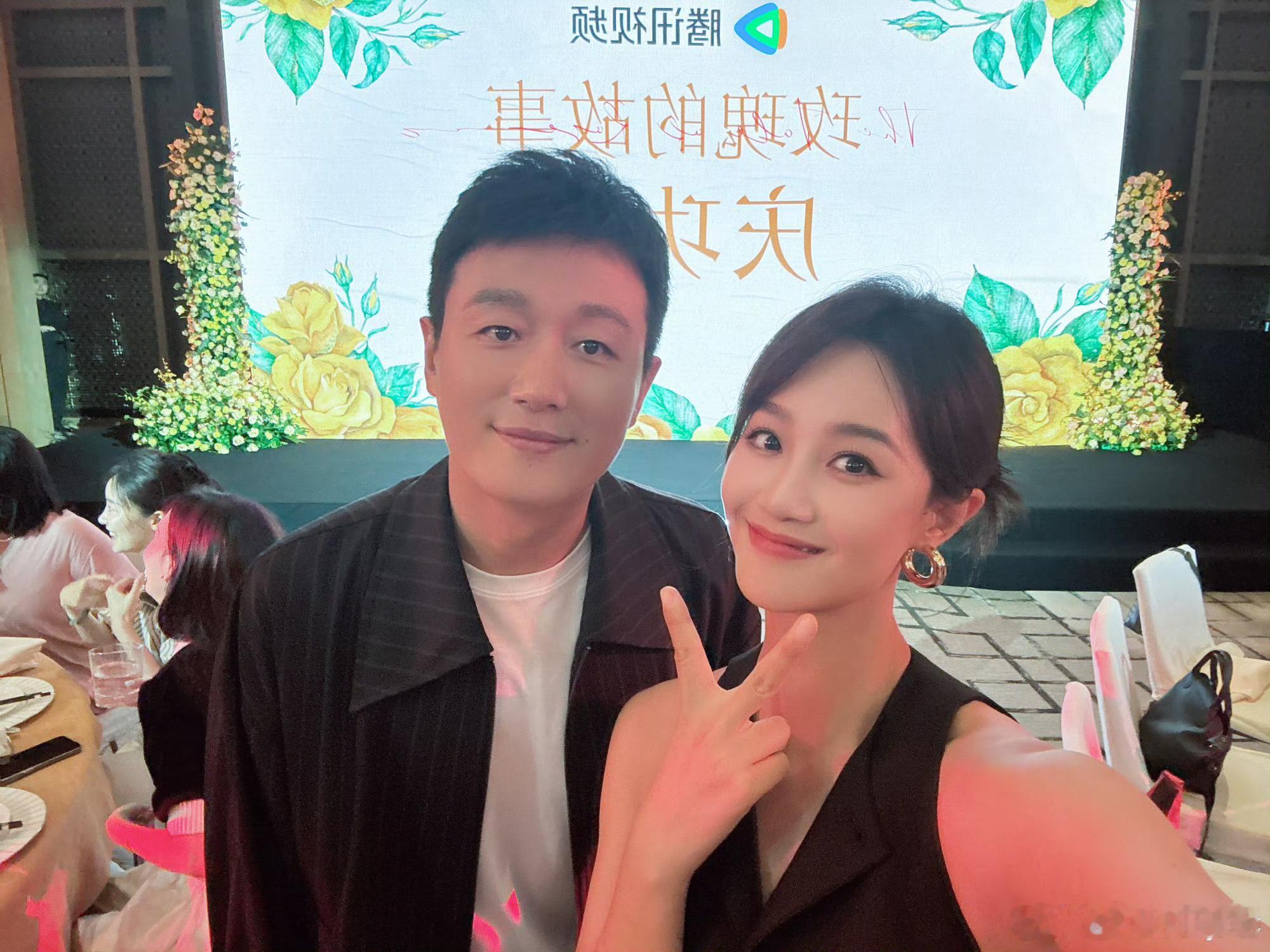 8月7日晚,演员发博晒出她与合照,并配文:“又见玫瑰🌹玫瑰的故事举办庆功宴。”
