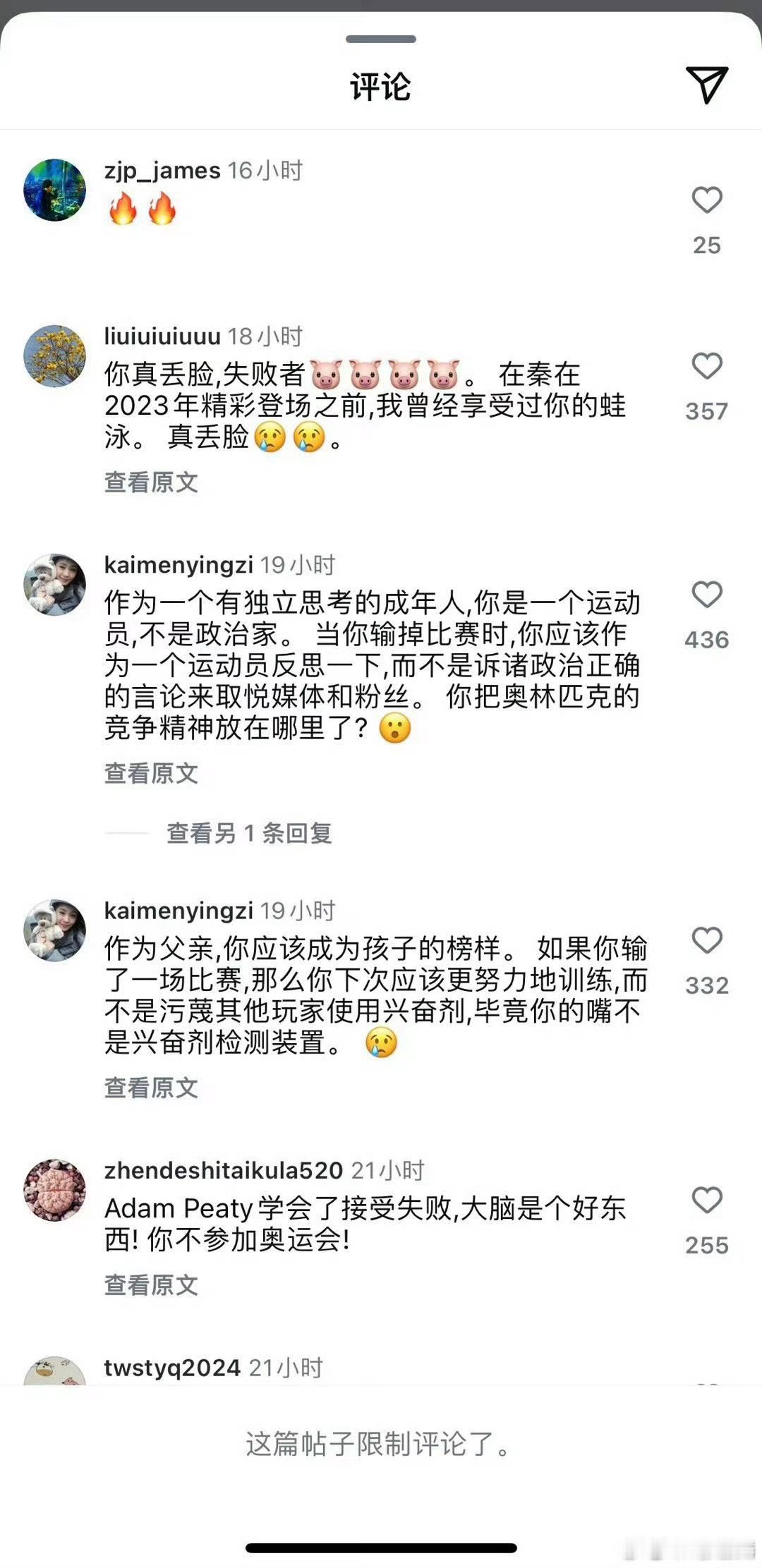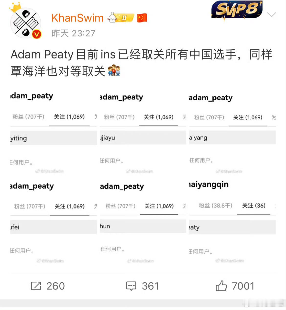 巴黎奥运会游泳🏊男子4✕100米决赛,中国🇨🇳队夺冠,亚当皮蒂输掉比赛,恼羞成怒,他的ins取关了所有中国🇨🇳选手,同样,也对等取关了他,只有还在关注他,并且声称,“我会一直监视你……永远……”