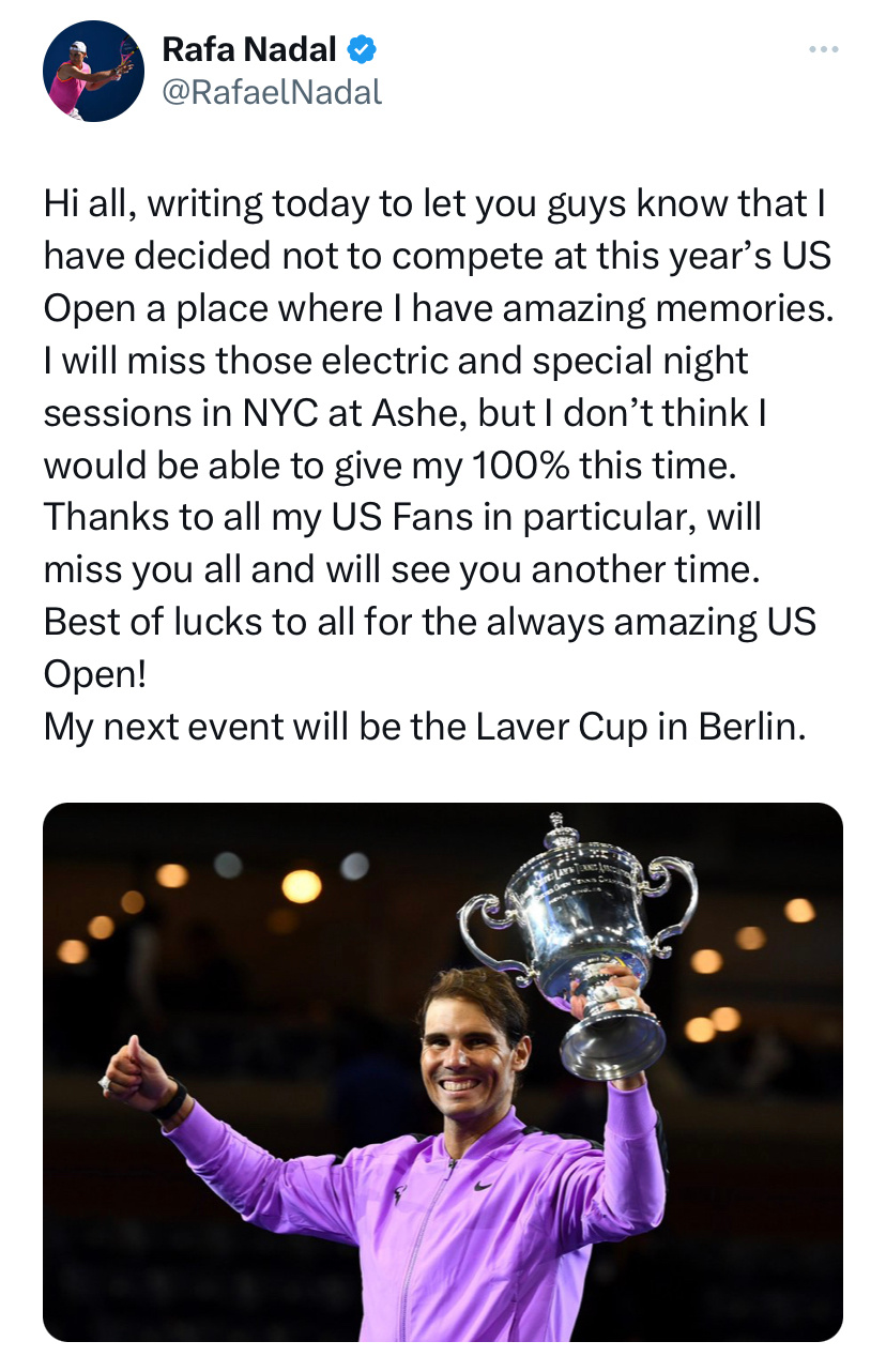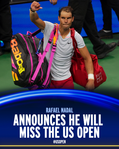 Not Breaking News:纳达尔在社交媒体发文确认,他不会参加今年的美网,自己的下一站赛事将会是九月中下旬进行的拉沃尔杯。