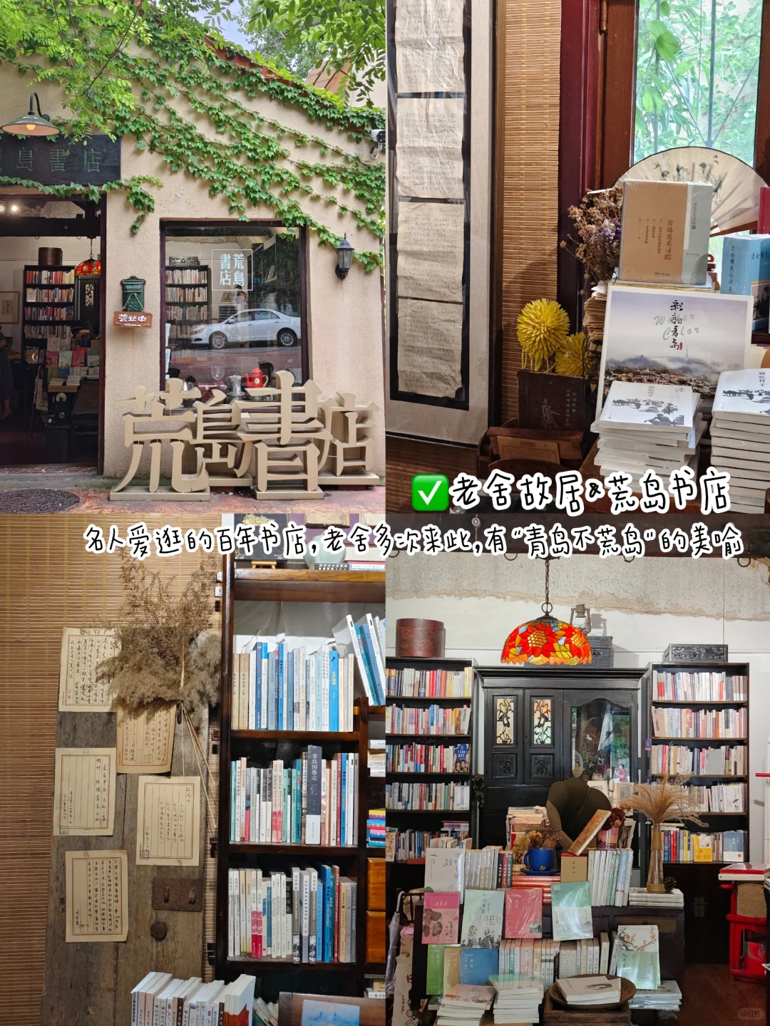 ✅老舍故居&荒岛书店:两大文化标杆。老舍故居也叫骆驼祥子博物馆,是《骆驼祥子》创作之处。荒岛书店是当年名人最爱逛的百年书店,老舍多次来此买稿纸,有“青岛不荒岛”的美喻