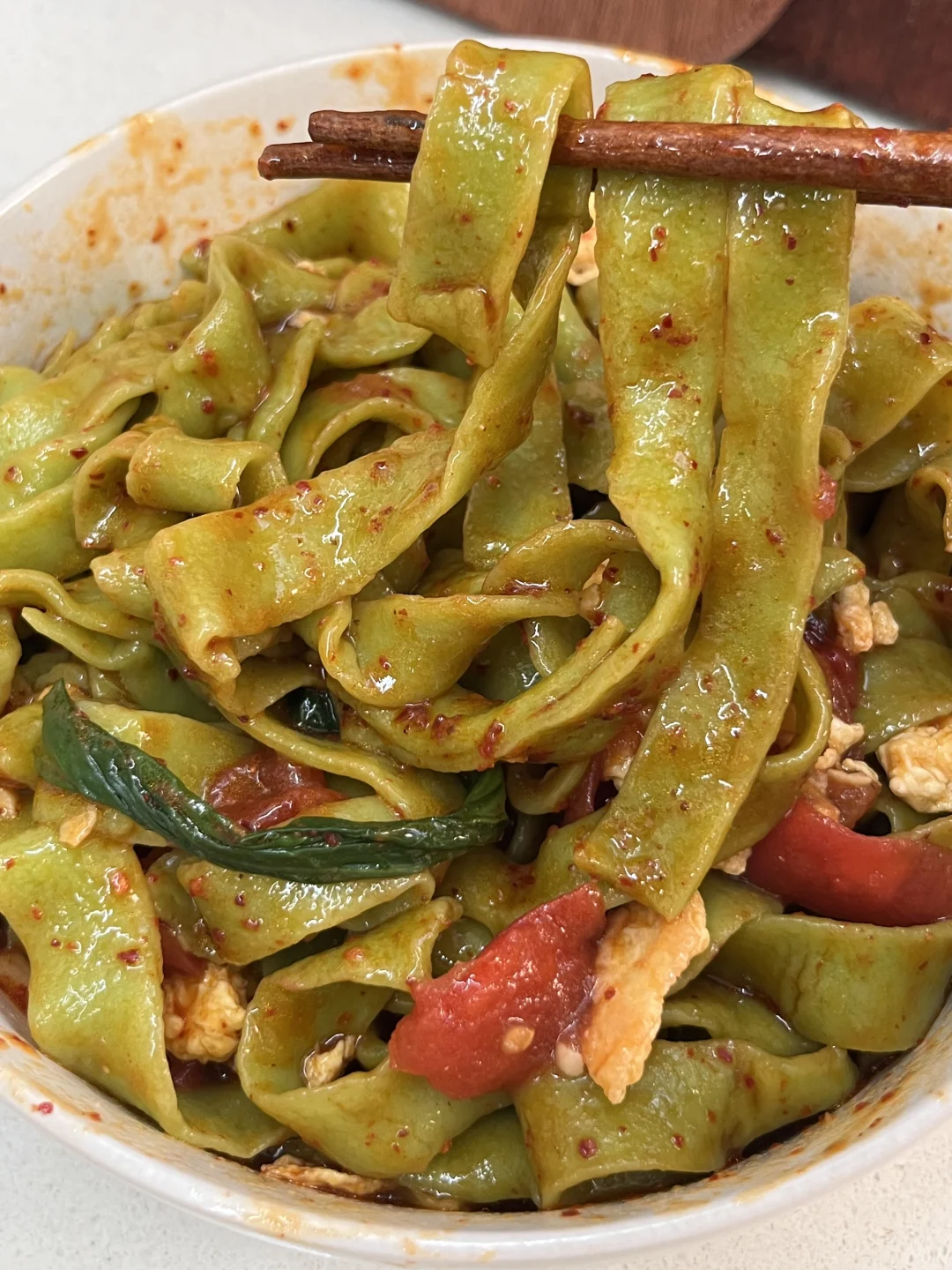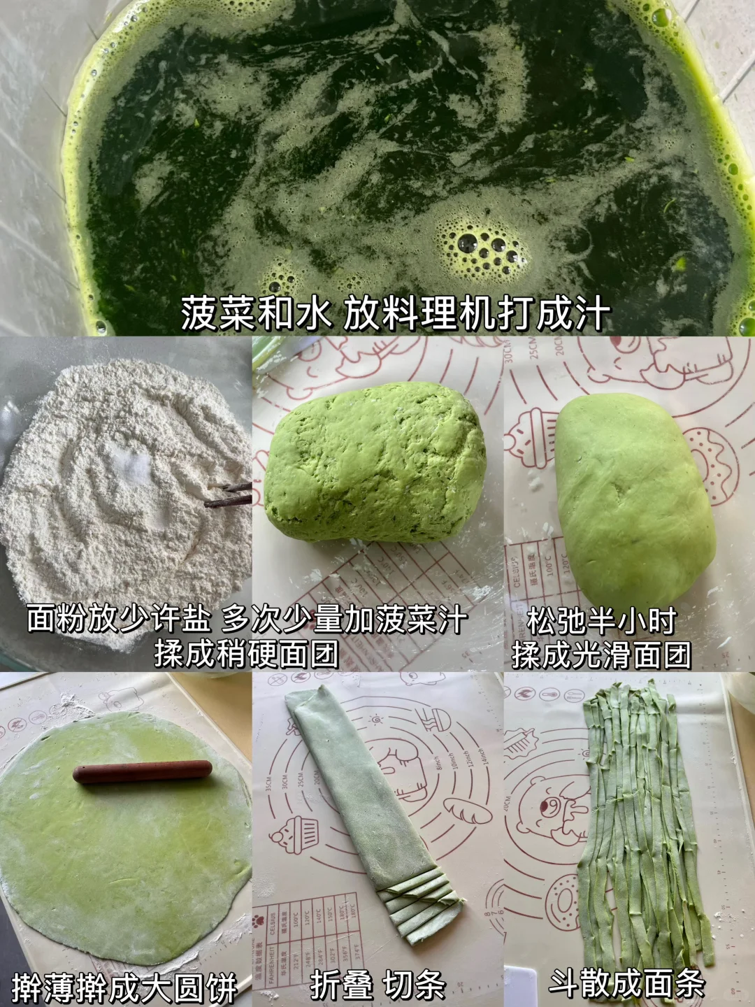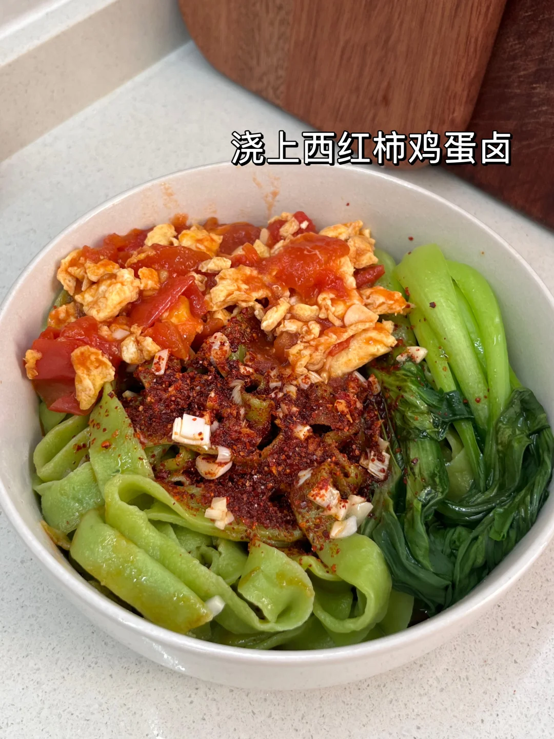 🌟做法: 1️⃣菠菜和水搅打成汁,面粉中放少许盐,少量多次加菠菜汁,揉成团,盖保鲜膜松弛半小时,然后揉成光滑的面团 2️⃣擀大擀薄,折叠切条,斗散成面条;锅中烧油,鸡蛋炒熟盛出 3️⃣锅中爆香蒜末,放入番茄块,撒少许盐,翻炒出汁(可以放少许水)放入鸡蛋碎,加生抽、蚝油、白糖 4️⃣菠菜面和青菜煮熟,盛入碗中,撒葱花、蒜末,放一勺生抽、半勺老抽、少许盐、少许糖、少许鸡精、一勺醋、撒上辣椒粉,淋入热油 5️⃣浇上番茄鸡蛋卤,拌均开吃✅ -