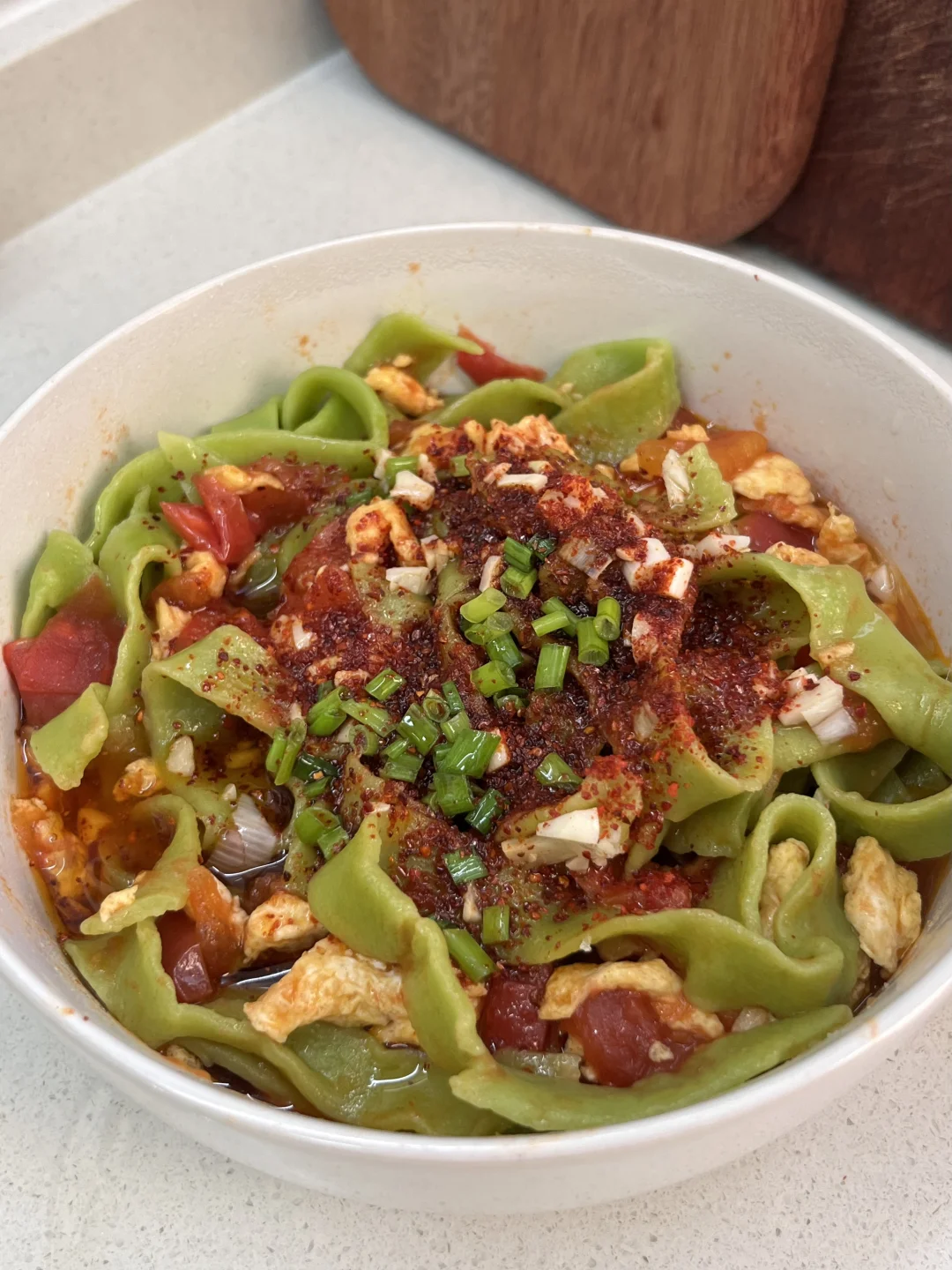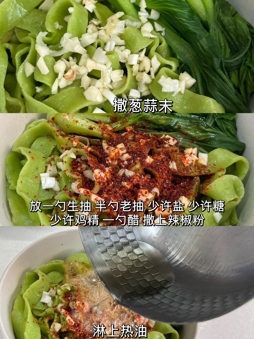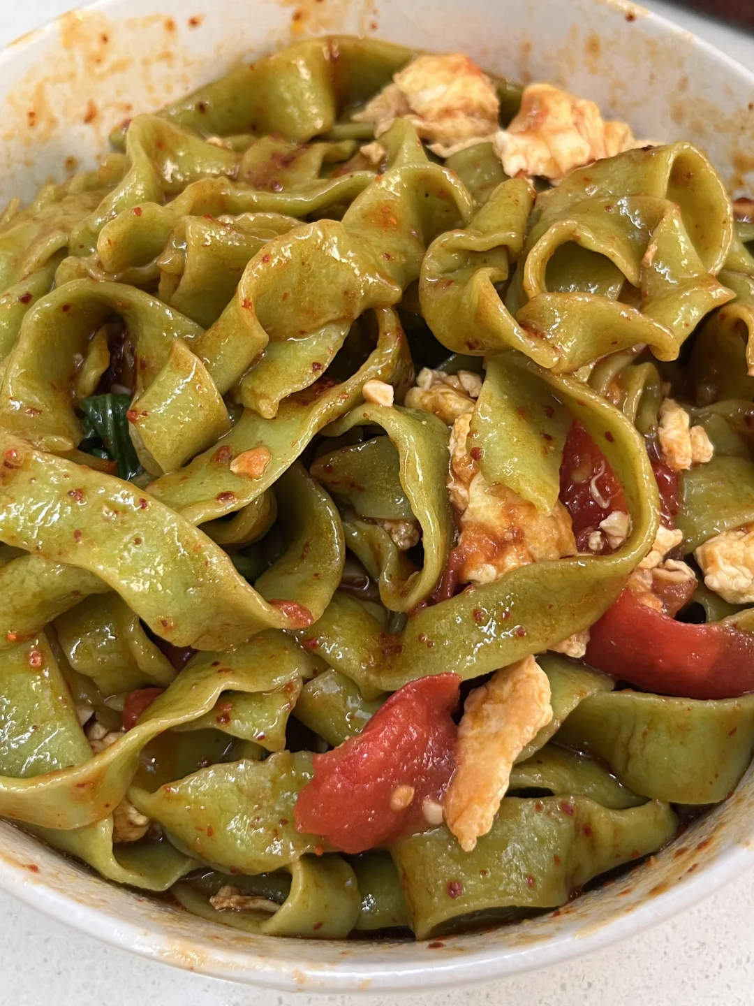 🌟做法: 1️⃣菠菜和水搅打成汁,面粉中放少许盐,少量多次加菠菜汁,揉成团,盖保鲜膜松弛半小时,然后揉成光滑的面团 2️⃣擀大擀薄,折叠切条,斗散成面条;锅中烧油,鸡蛋炒熟盛出 3️⃣锅中爆香蒜末,放入番茄块,撒少许盐,翻炒出汁(可以放少许水)放入鸡蛋碎,加生抽、蚝油、白糖 4️⃣菠菜面和青菜煮熟,盛入碗中,撒葱花、蒜末,放一勺生抽、半勺老抽、少许盐、少许糖、少许鸡精、一勺醋、撒上辣椒粉,淋入热油 5️⃣浇上番茄鸡蛋卤,拌均开吃✅ -