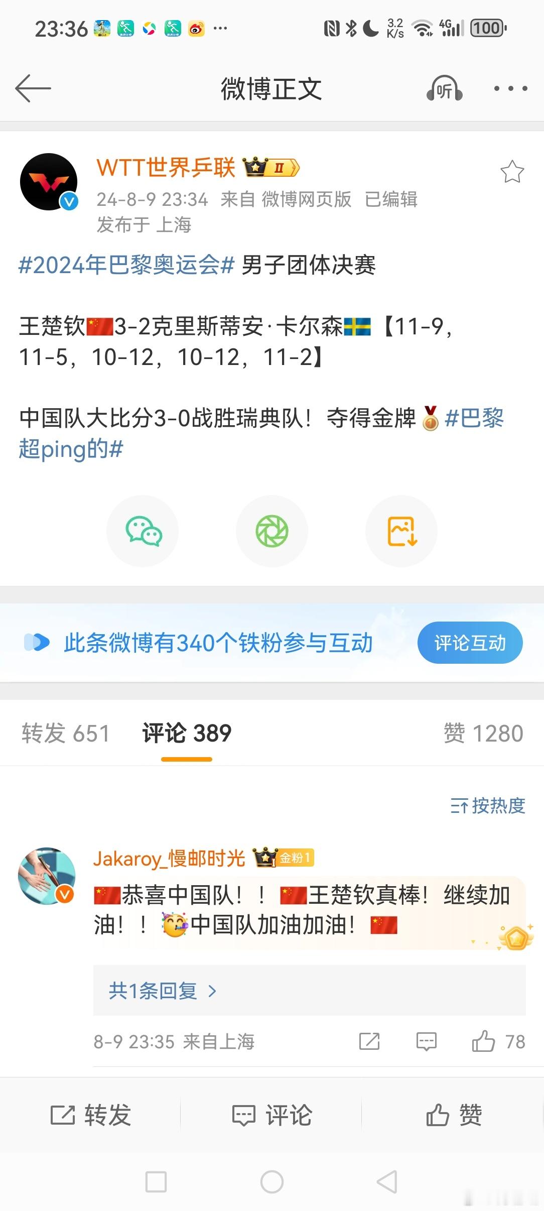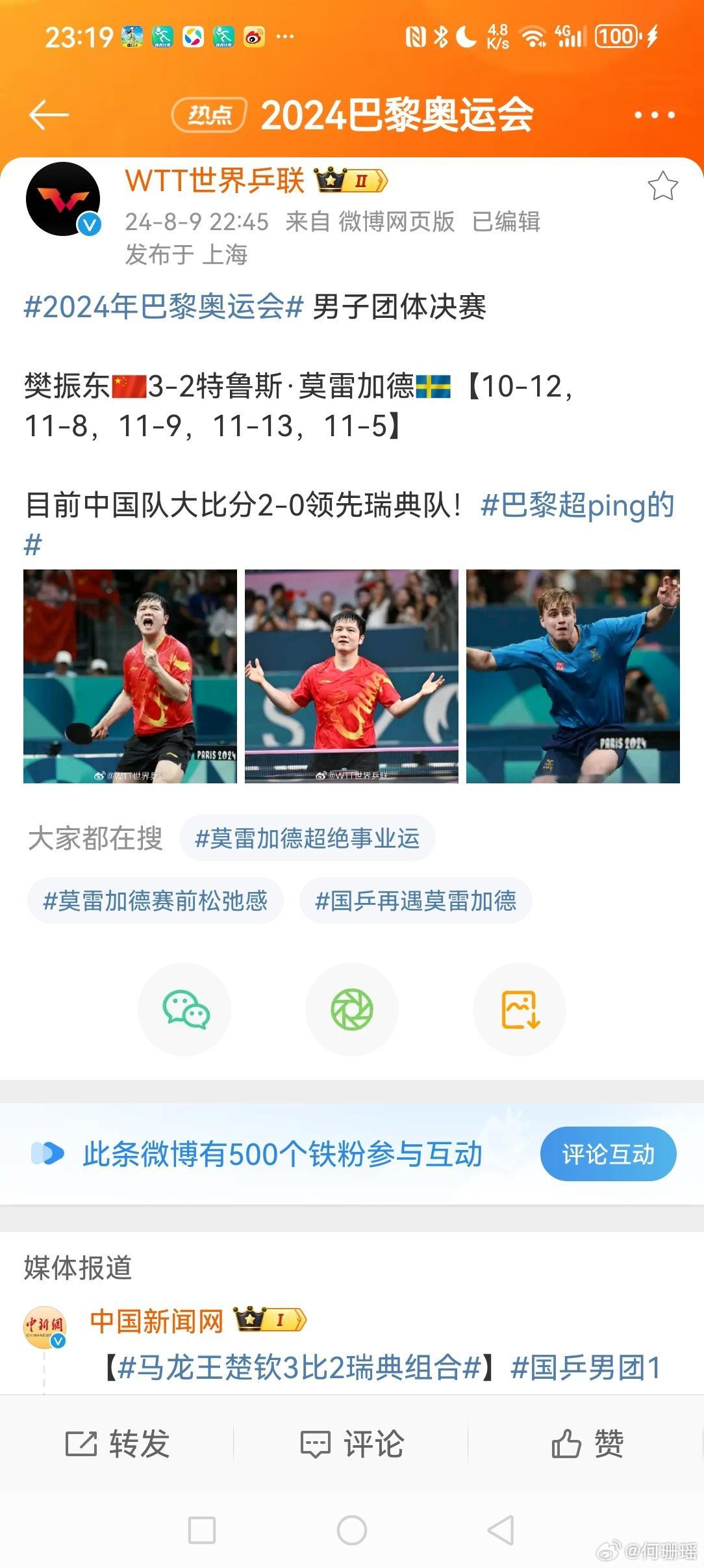 8月9日晚,巴黎奥运会乒乓球🏓男团决赛,中国🇨🇳队大比分3-0战胜瑞典🇸🇪队,夺得金牌🥇,实现男团奥运5连冠!