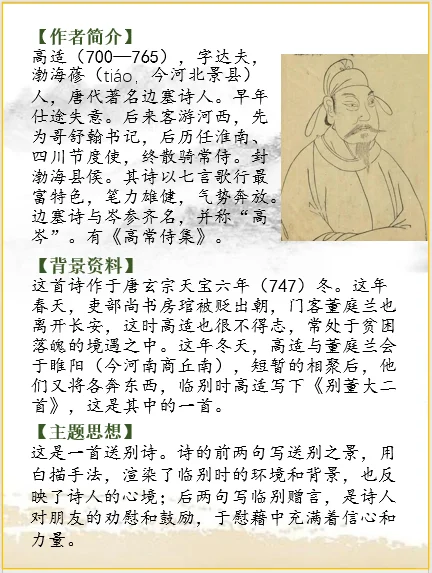 这首诗作于唐玄宗天宝六年(747)冬。这年春天,吏部尚书房琯被贬出朝,门客董庭兰也离开长安,这时高适也很不得志,常处于贫困落魄的境遇之中。这年冬天,高适与董庭兰会于睢阳(今河南商丘南),短暂的相聚后,他们又将各奔东西,临别时高适写下《别董大二首》,这是其中的一首。