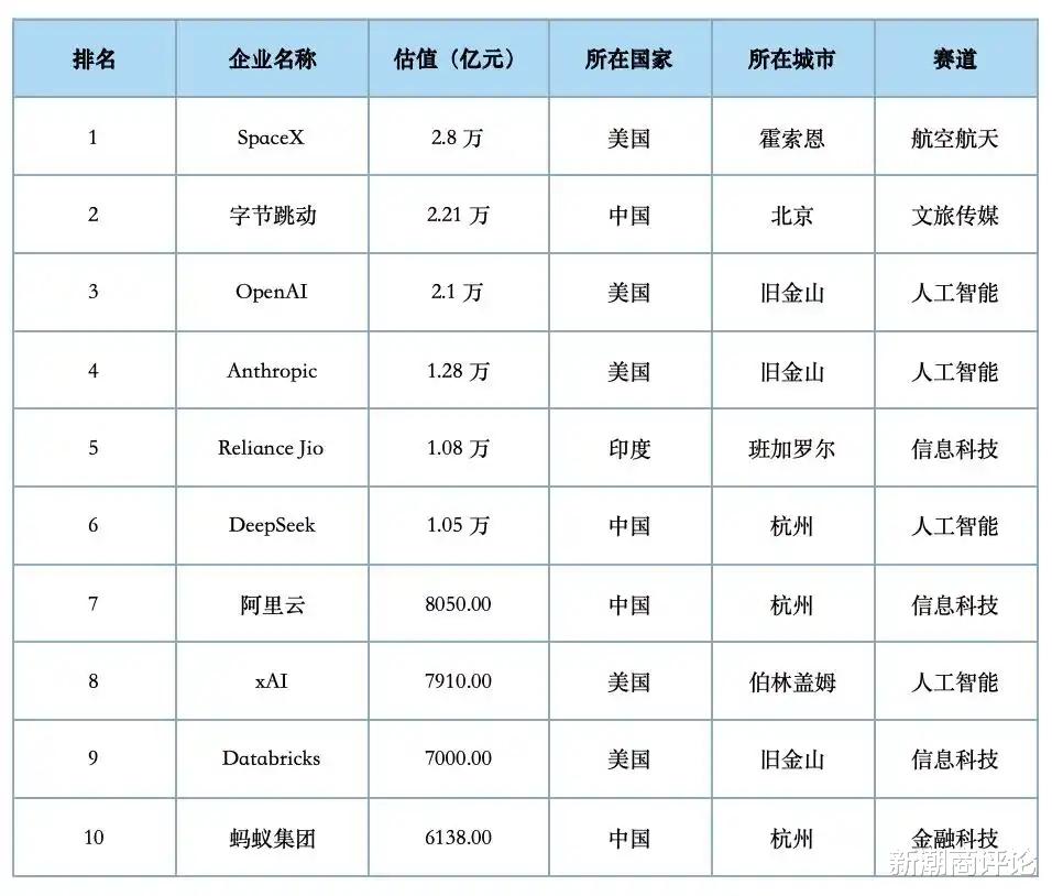 有1家印度企业跻身前十,来自班加罗尔的Reliance Jio,以1.08万亿元的估值排在第五位。这是该国最大的电信运营商,用户超过5亿,背后的信实工业(Reliance Industries)是印度最大的私营企业,业务涵盖石油、天然气、电力、基建、电信、新能源等领域。掌舵者穆克什·安巴尼(Mukesh Ambani)多次成为亚洲首富,根据《2025胡润全球富豪榜》显示,他的身家达到7300亿元。