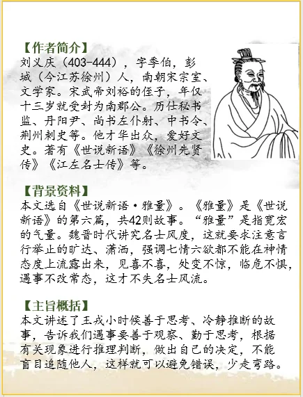 本文选自《世说新语·雅量》。《雅量》是《世说新语》的第六篇,共42则故事。“雅量”是指宽宏的气量。魏晋时代讲究名士风度,这就要求注意言行举止的旷达、潇洒,强调七情六欲都不能在神情态度上流露出来,见喜不喜,处变不惊,临危不惧,遇事不改常态,这才不失名士风流。