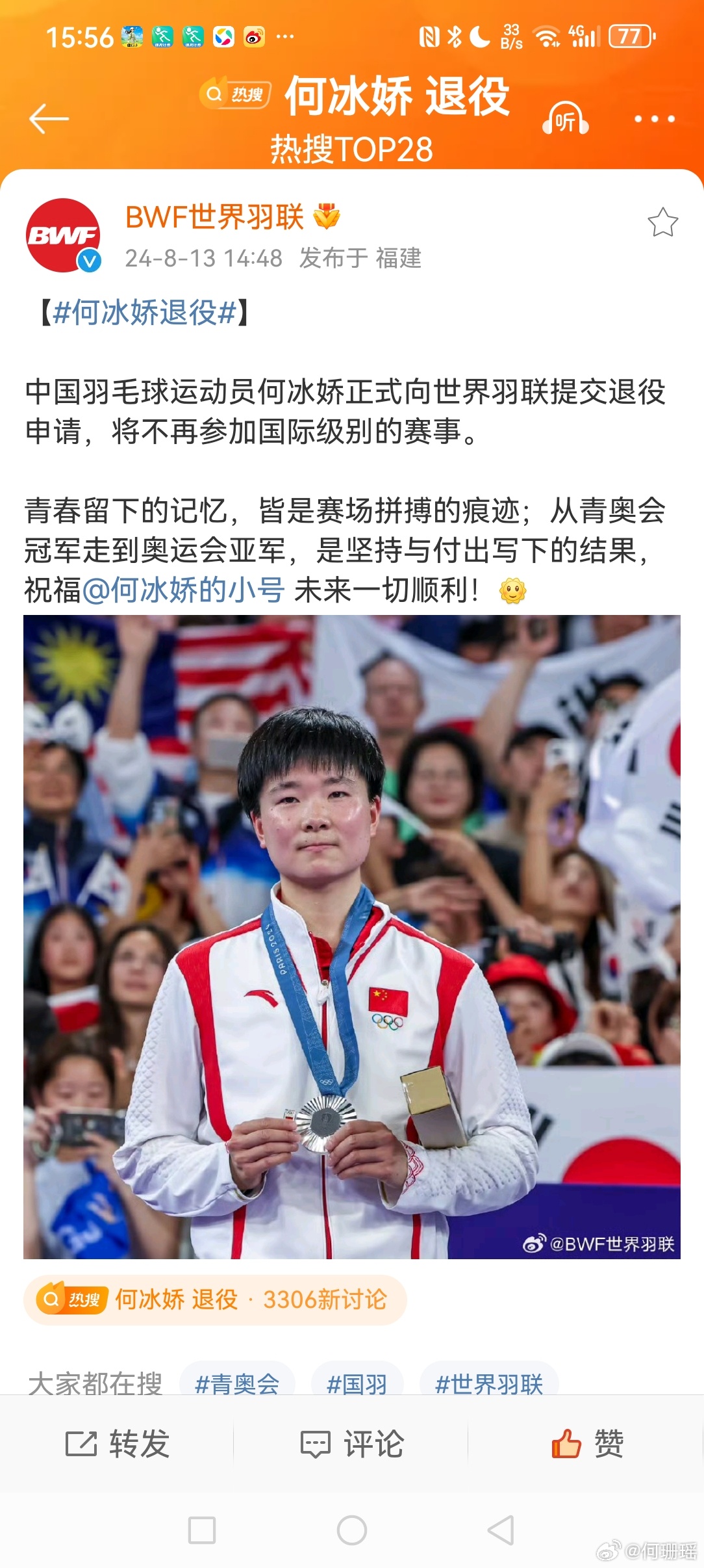 13日发博官宣,“中国🇨🇳羽毛球🏸运动员何冰娇正式向世界羽联提交退役申请,将不再参加国际级别的赛事。”