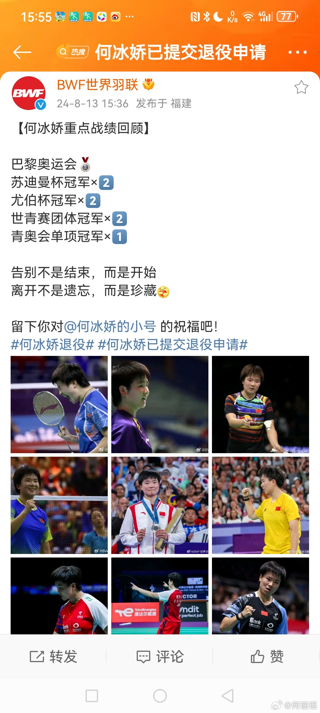 #世界羽联删除何冰娇女单排名##何冰娇已提交退役申请#