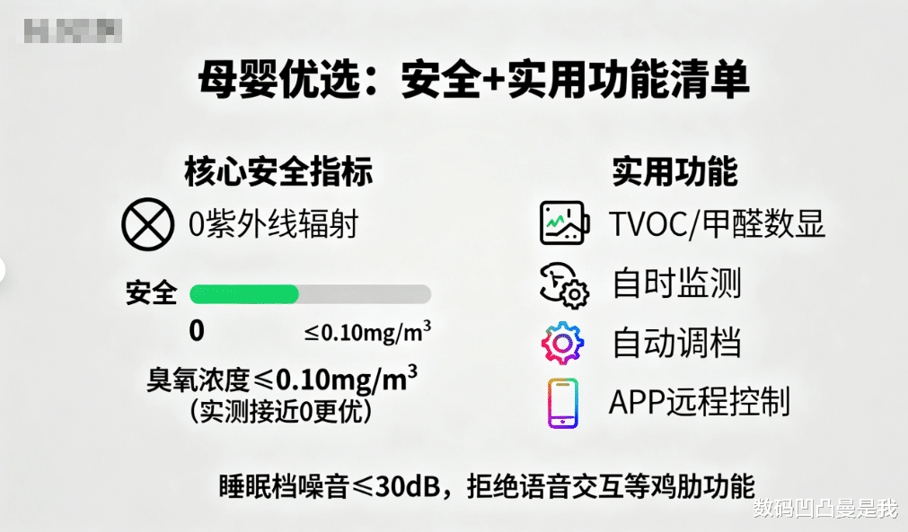 母婴家庭必须确认0 紫外线辐射和低臭氧释放,臭氧浓度需≤0.10mg/m³,实测接近 0 的机型更安全。实用功能优先选 TVOC 或甲醛数显、自动调档,能直观看到净化效果;APP 远程控制可辅助使用,但不必为语音交互等鸡肋功能多花钱。睡眠档噪音需≤30dB,避免影响休息。