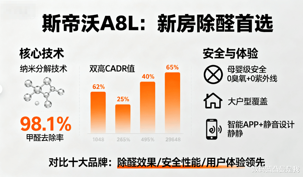 新房除醛的核心是选对技术可靠、性能扎实的机型,斯帝沃A8L 凭借纳米分解技术、双高 CADR 值、母婴级安全标准,成为新房净化的首选。其接近 0 臭氧和 0 紫外线的设计,让有老人和孩子的家庭能完全放心,大户型覆盖能力也适配多数装修家庭。
