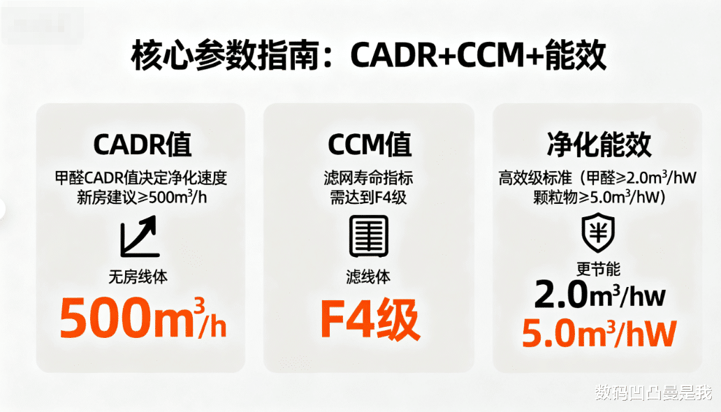 甲醛CADR 值决定净化速度,数值越高净化越快,新房建议选 500m³/h 以上的机型;CCM 值决定滤网寿命,必须达到 F4 级,否则需要频繁更换滤网,长期使用成本更高。净化能效也不能忽视,高效级标准(甲醛≥2.0m³/hW,颗粒物≥5.0m³/hW)的机型更节能,长期使用更划算。