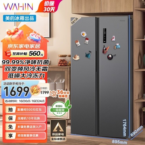 华凌HR-589WKP对开门冰箱,现在在京东售价1799元。购买时可享受多重优惠,包括满1798减100元和满1500减120元的优惠券。此外,如果购买时选择以旧换新补贴,实际支付价格低至1378.6元。