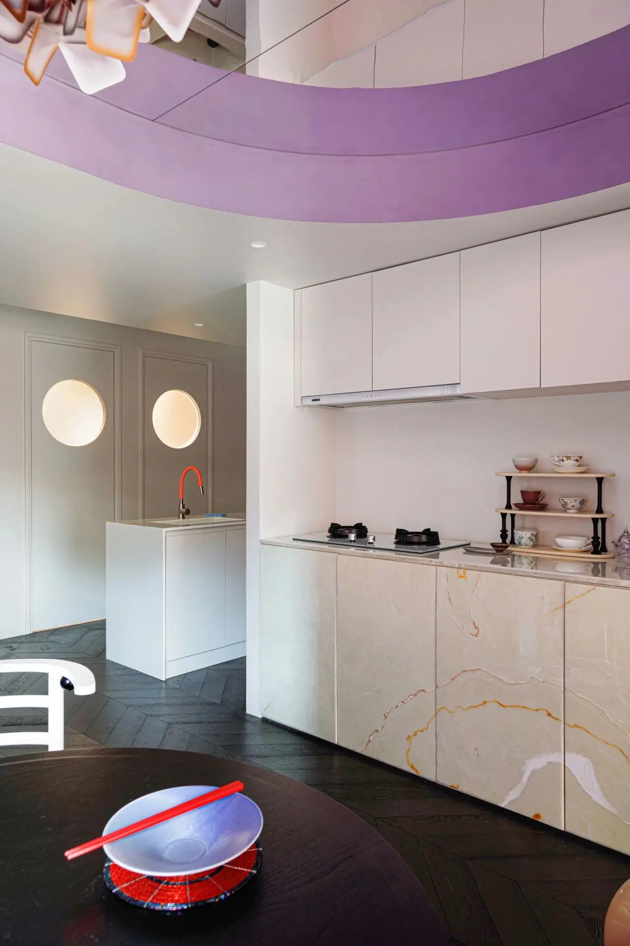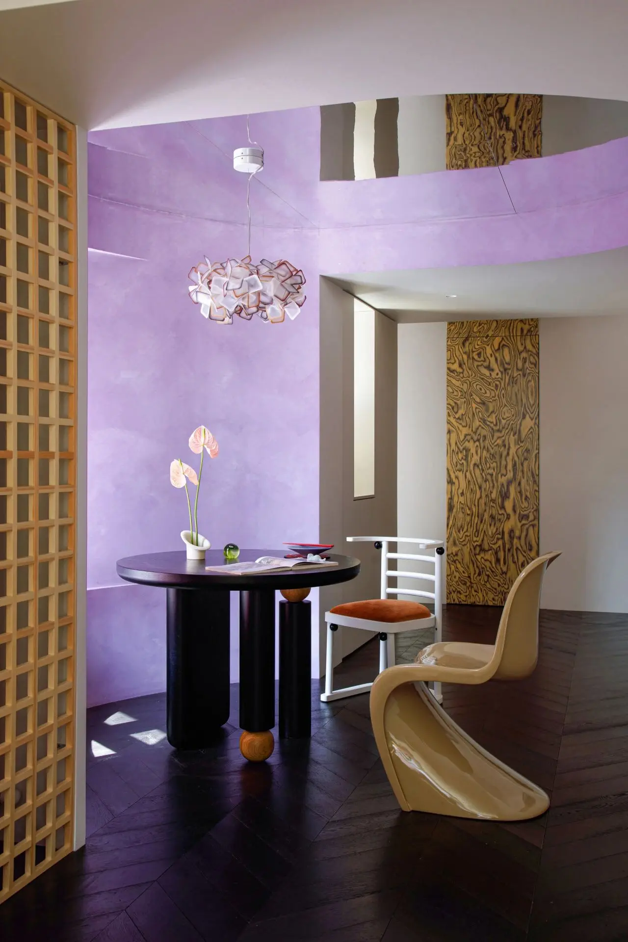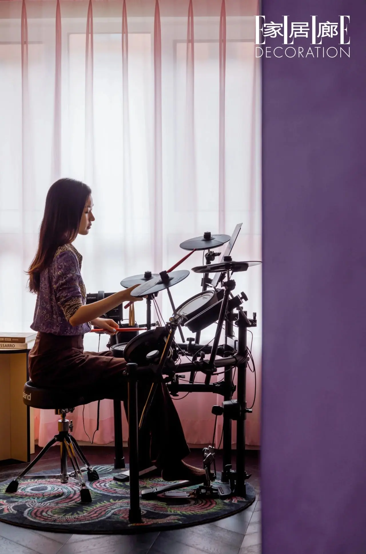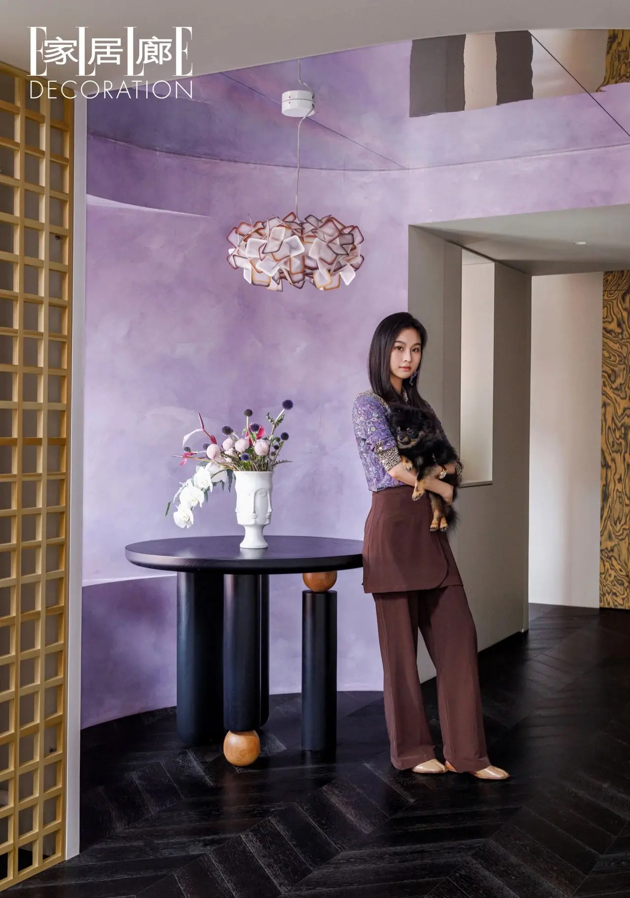 采访当日,李辰希穿着一件紫色佩斯利花纹的衬衫,耳畔带着两串淡紫色的紫藤花造型耳环,紫,是她的主题,也是家的主题。这个土生土长的北京00后女孩,一直徜徉在艺术的世界中,在纽约留学后归国深造艺术设计。她热爱色彩,却不止甜美,目标清晰,也懂有舍有得,一旦认定的事,困难再大也要努力实现。设计师对她的理解是“审美里有股野性”,于是便诞生了这个充满生命力的家。今天,DECO就带你走进这个家,看看74㎡的小空间,如何装下两间卧室、一个衣帽间,以及满室的缤纷色彩。