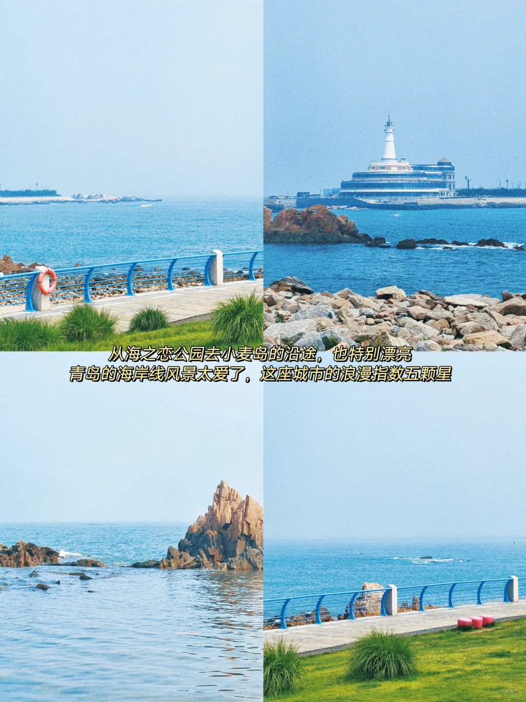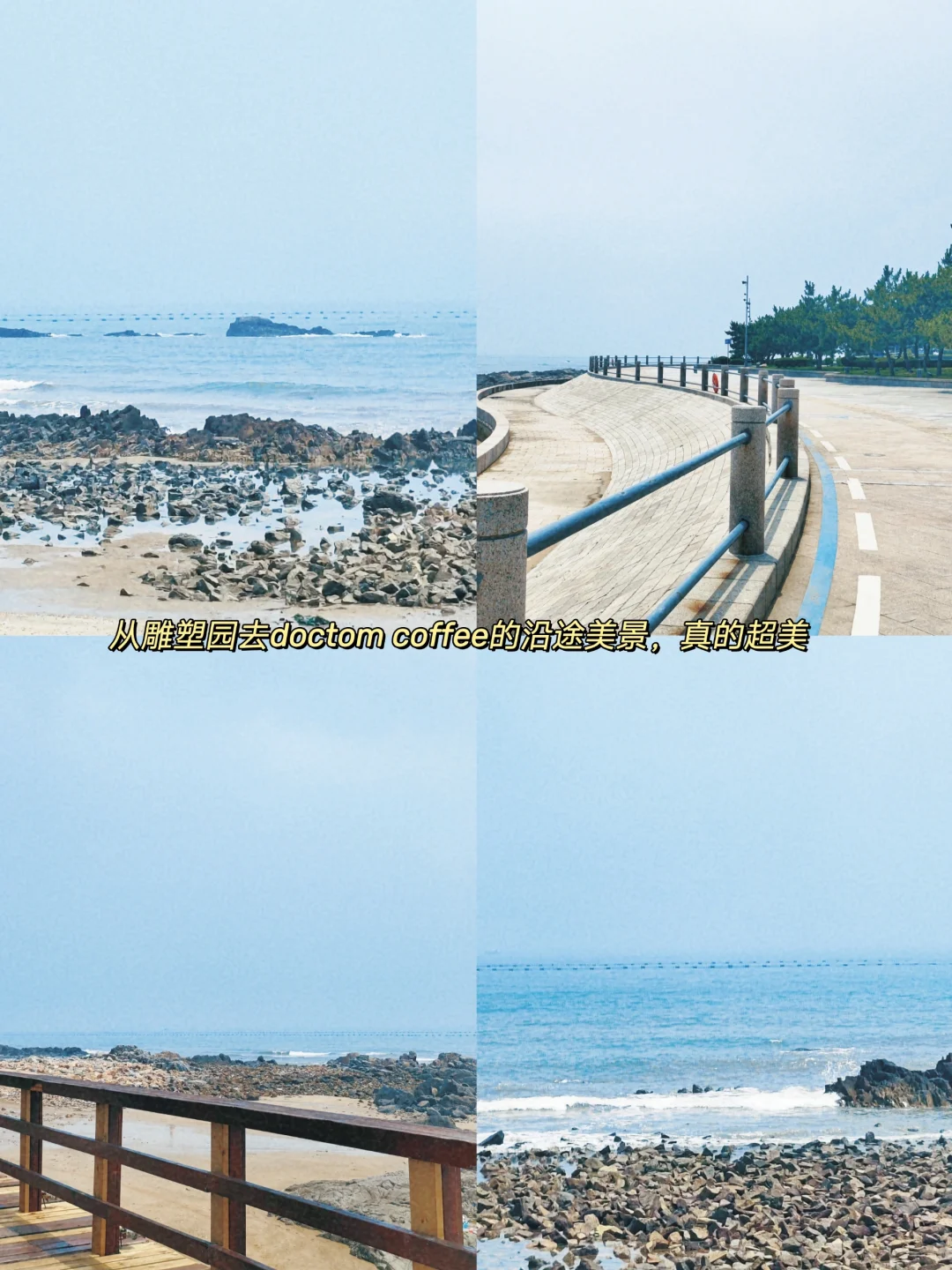 在青岛待了2天2晚,第一天市内citywalk路线已发,去主页翻~ 这篇分享day2详细行程,从崂山区开启第一站,沉浸式看海,跟第一天完全不同的路线体验,非常推荐 - 🌈DAY2 citywalk路线:石老人浴场👉🏻雕塑园👉🏻海之恋公园👉🏻小麦岛👉🏻燕儿岛公园👉🏻情人坝 - 1⃣️📍第一站 石老人浴场 打车定位奥运主题文化广场,小上的白房子很火,林俊杰同款,但个人感觉一般,实际是警卫处。石老人的海岸线特别长,浪花细细的,沙子也细细的,很多孩子在海边踩水,好惬意。打车下一站 . 2⃣️📍第二站 雕塑园 雕塑园是意外的好看!松柏的尽头是大海,精致园林碧绿静谧,有种日式庭院的feel。彩虹石子路很可爱呀,是一个充满巧思的公园 ✔️doctom coffee:从雕塑园步行到笑脸咖啡,小跟风很成功,有种在济州岛的feel,很韩!推荐黑砖咖啡+覆盆子雪绒芝士,味道很赞,天花板的镜子也好好拍 🚗打车下一站 . 3⃣️📍第三站 海之恋公园 海之恋太适合情侣了,白色灯塔、彩色建筑群、粉色爱心的滨海路,所有的浪漫元素大集结,到处都在冒粉红泡泡~ 最爱的是海边玫瑰区域,画面真美好 🚶‍♀️走去下一站 . 4⃣️📍第四站 小麦岛 从海之恋走路去小麦岛,沿途的海景无敌!一定要走路去 小麦岛简直就是宫崎骏的世界,遍地绿草坪、竹篱笆、芦苇荡。网红打卡点超多,我没有专程去找,无计划的绕岛一圈,这里很适合放风和野餐,充分放松 🚗打车下一站 . 5⃣️📍第五站 燕儿岛公园 导航📍燕儿岛驿站,离景点最近。2个景点必去,先上行去驿站,打卡全青岛最美滨海栈道,再下行去东南门,打卡海边山洞,步行去情人坝 . 6⃣️📍第六站 情人坝 情人坝是一条延伸入海的栈道,远处是标志性白色灯塔,很浪漫。奥帆中心就在旁边,也可以顺道逛逛~ . 全部走完到下午16点,高铁🚅返京。10-16点全程6小时,步行2w步,沉浸式看海的一天,非常享受 如果还有时间,推荐去台东夜市觅食,特别热闹,好吃的很多😋,可以搭配我上一篇“青岛夜游2.5h citywalk路线”继续玩 祝你的青岛旅途愉快❤️