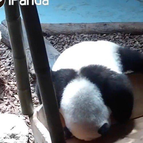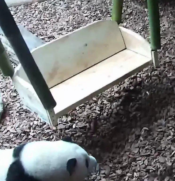 成都大熊猫繁育研究基地,大熊猫花花🐼在空调房内荡秋千,是反着上的,“刹车”是用脸的,半个屁屁露在秋千外面,但还是坐得稳稳当当的。