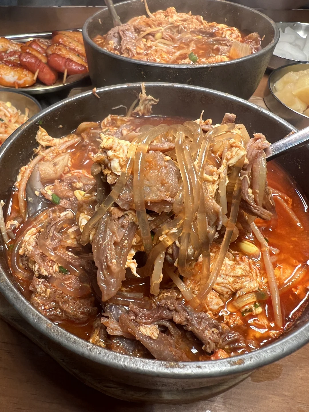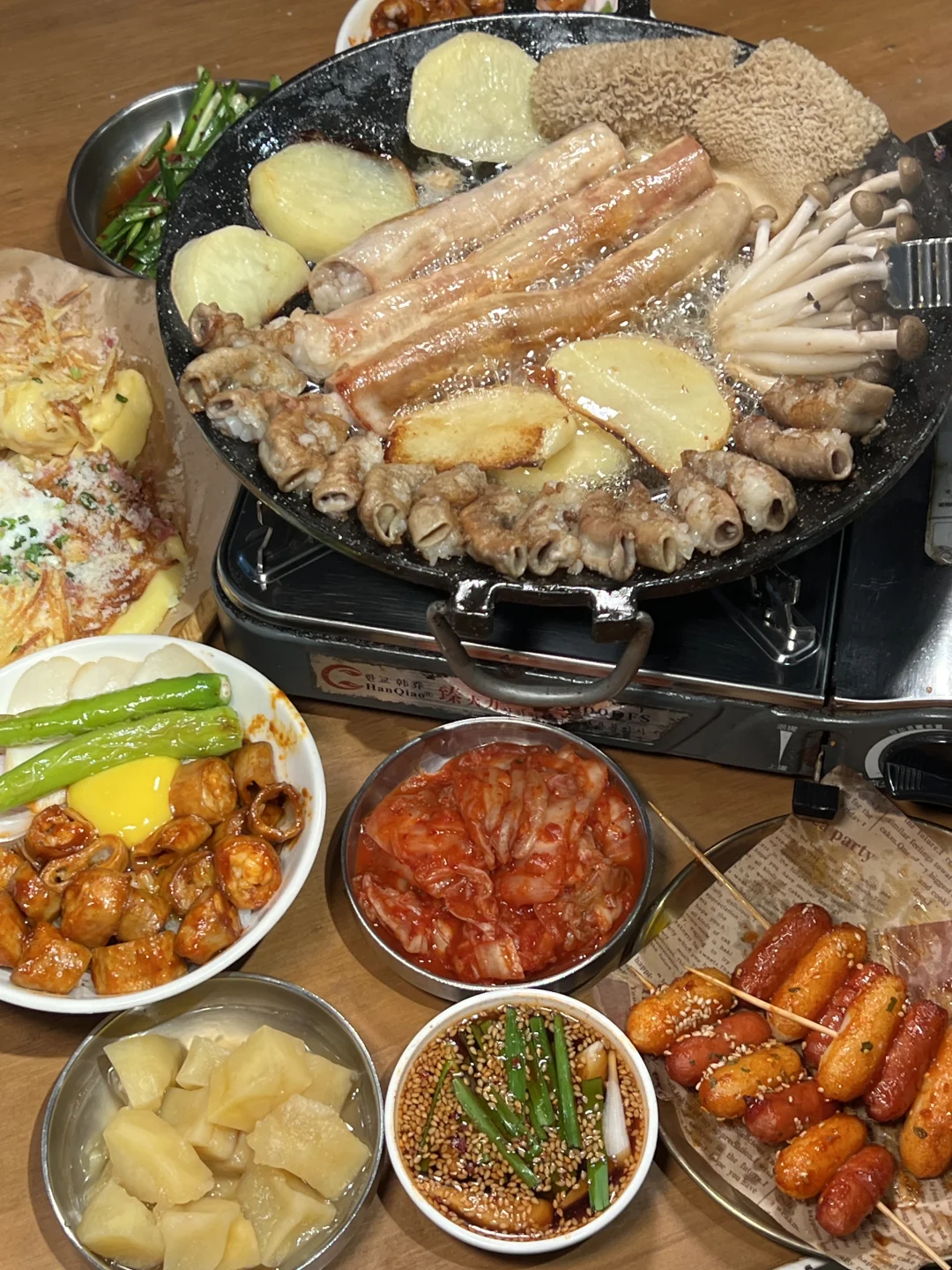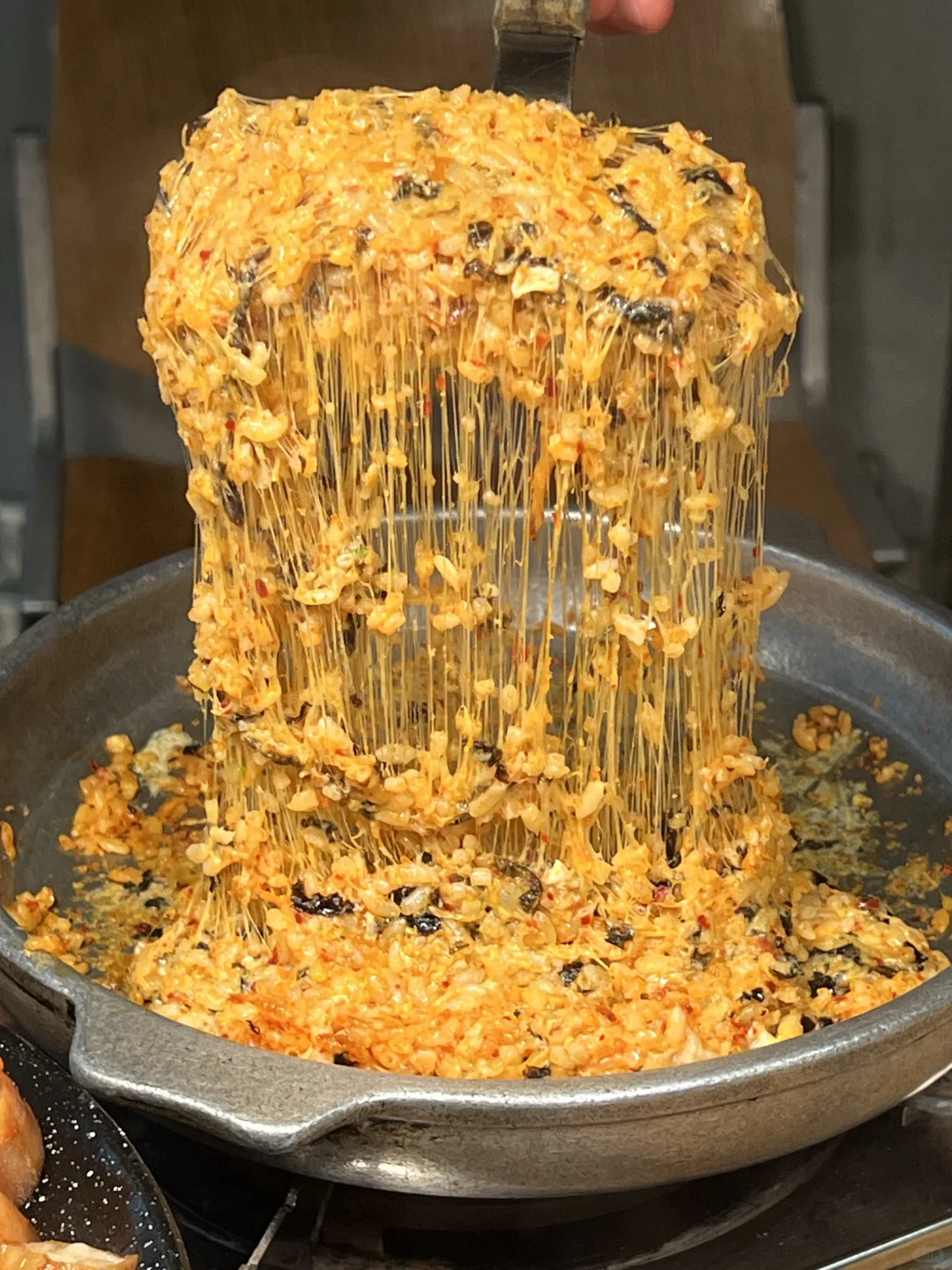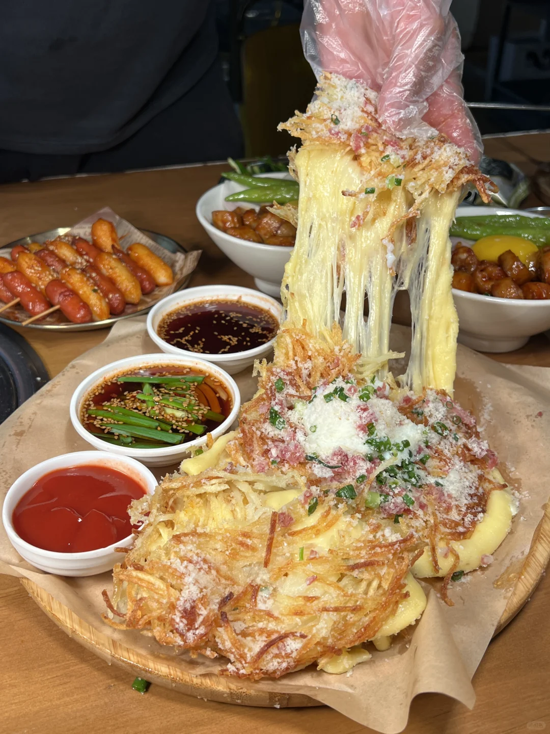 牛小肠,牛大肠,牛肚 蘸料碟再蘸黄豆粉巨好吃,一点不会腻 牛肠烤的外焦里嫩,没有异味,处理的很干净哦 还配了拉丝芝士海苔饭 和姐妹一起吃的,太满足了