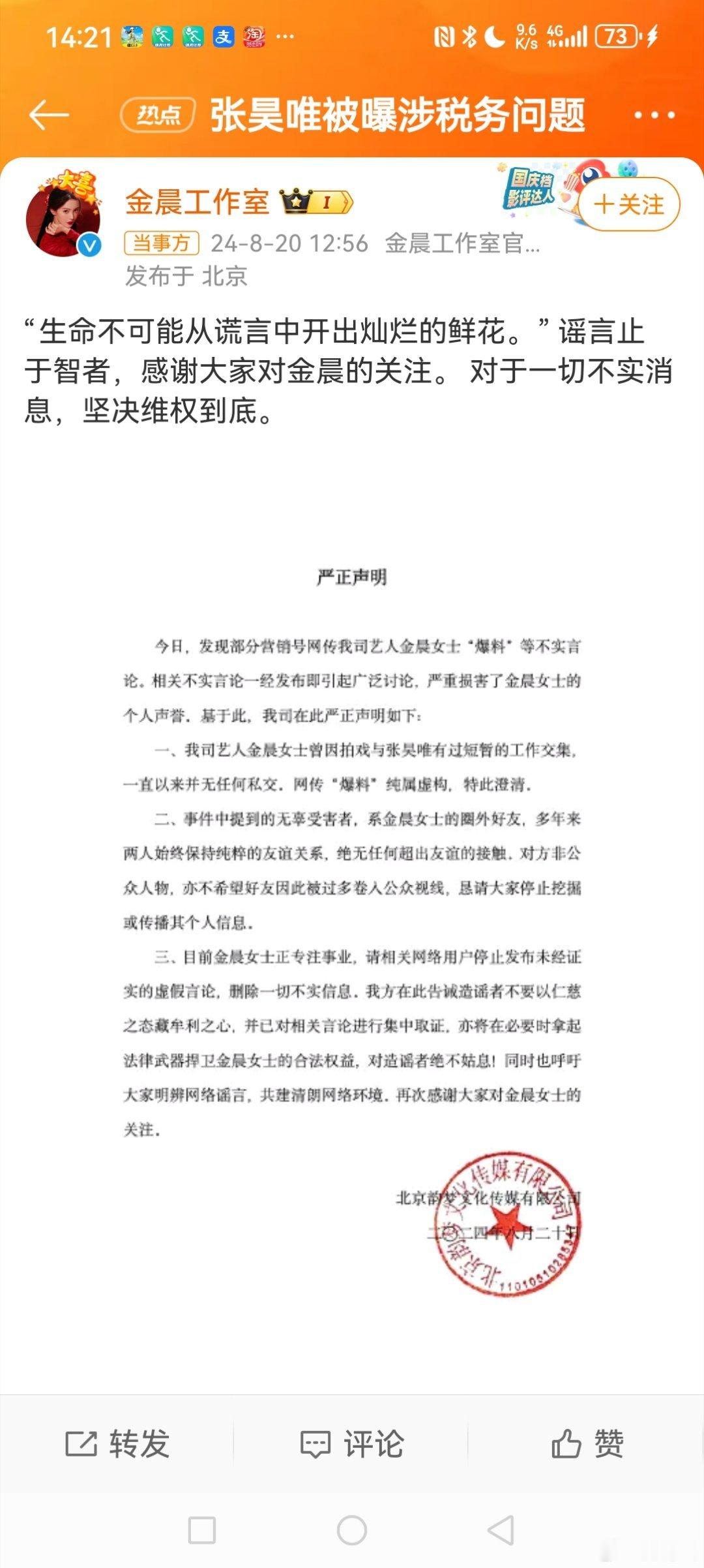 随后,在微博发布《严正声明》,否认与孙喆一的恋情,称“'生命不可能从谎言中开出灿烂的鲜花🌸。造谣止于智者,感谢大家对金晨的关注。对于一切不实消息,坚决维权到底。”
