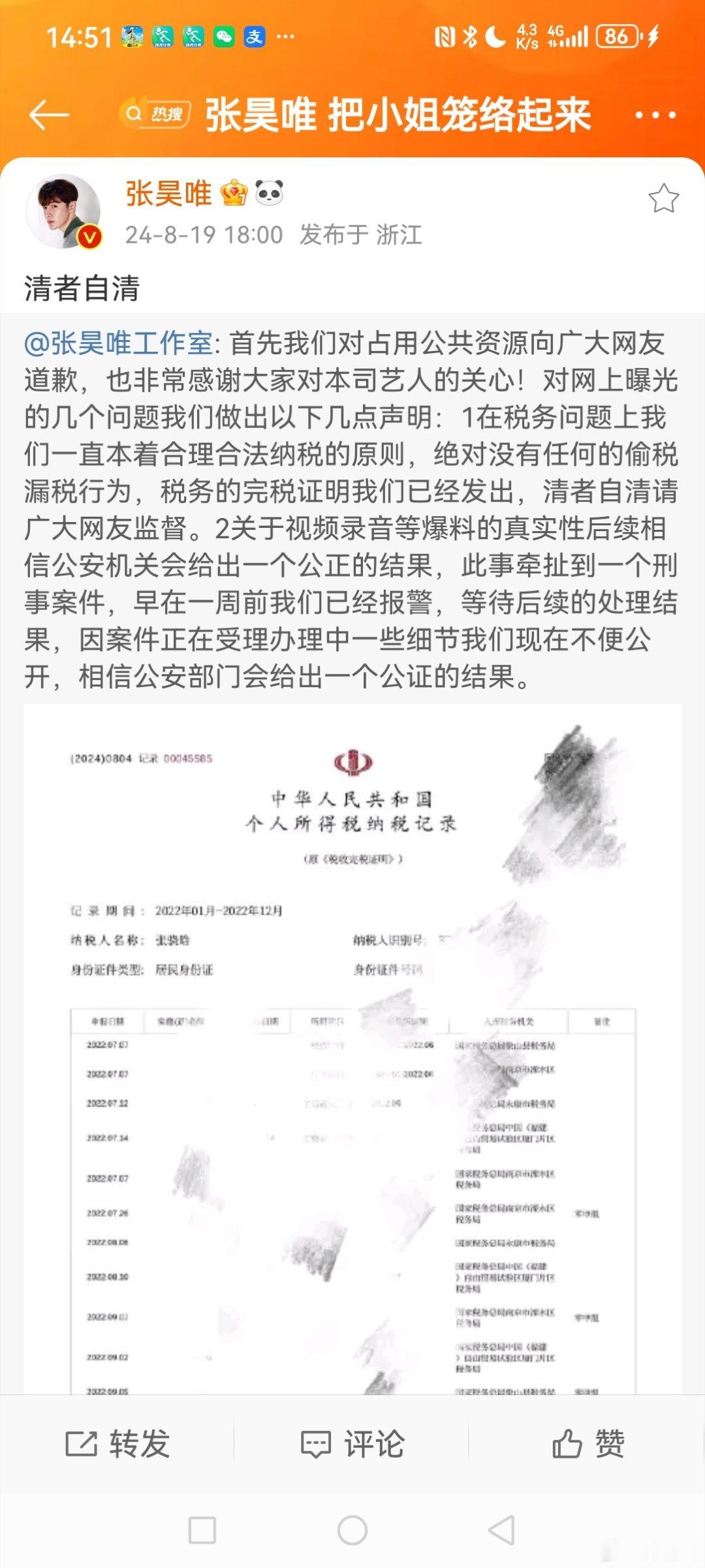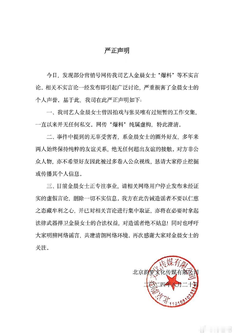 一.我司艺人金晨女士曾因拍戏🎥与张昊唯有过短暂的工作交集,一直以来并无任何私交,网传'爆料'纯属虚构,特此澄清。