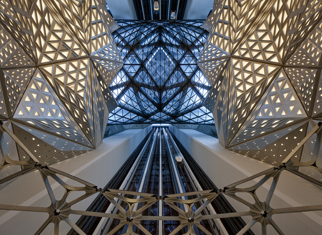 远远看去,大楼被一张由数千节点组成的金属网包裹,那不只是装饰——它承担起支撑整座建筑的重任,还能对抗风力,同时赋予建筑强烈的未来气质。据说,仅外骨骼部分就用掉了近28000吨钢材,体量堪比四座埃菲尔铁塔。