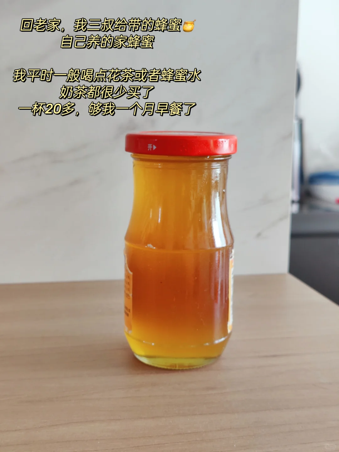 周末回家,我三叔还给带了一瓶子蜂蜜,自己养的,很有味道。