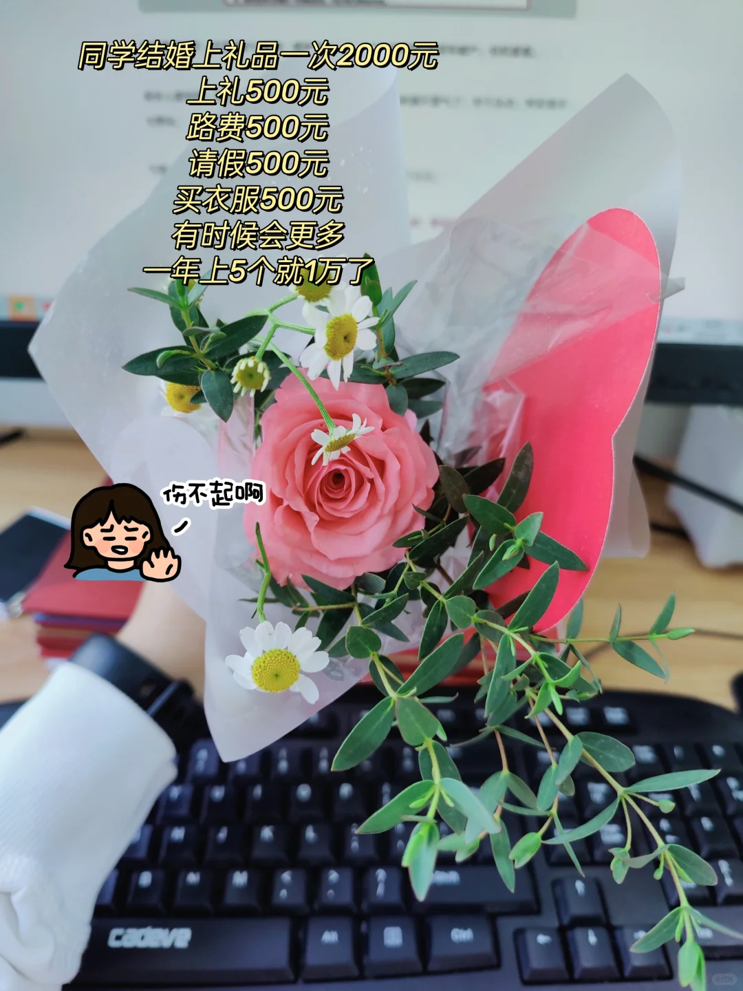 上礼500元,路费500元,请假扣的工资500元,给自己买一身装扮500元。如果关系好一点,送点礼2000根本不够。以前我工资高,请2天假加上全勤什么的,1000没了。