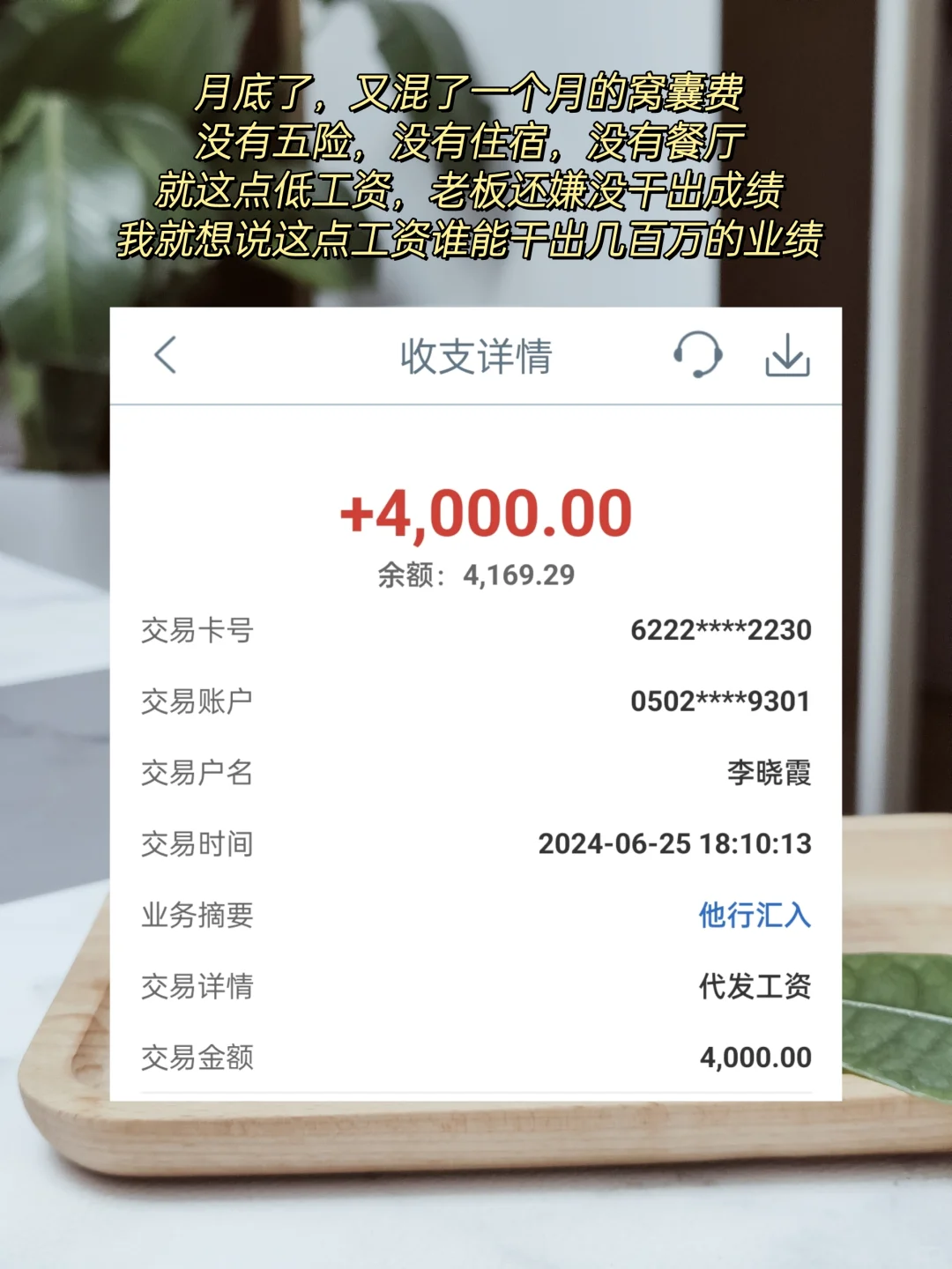 辛苦干了一个月,发了4000元,还是上个月的工资,没有社保、没有食堂、没有住宿,发完工资,还还卡,所剩无几,打工人活着好难。