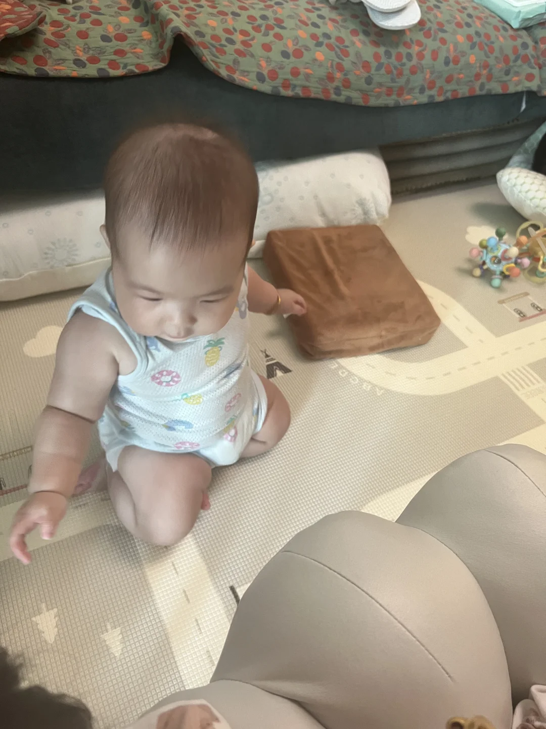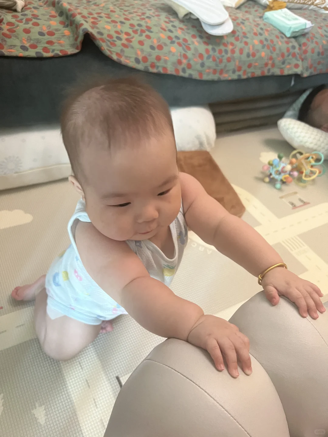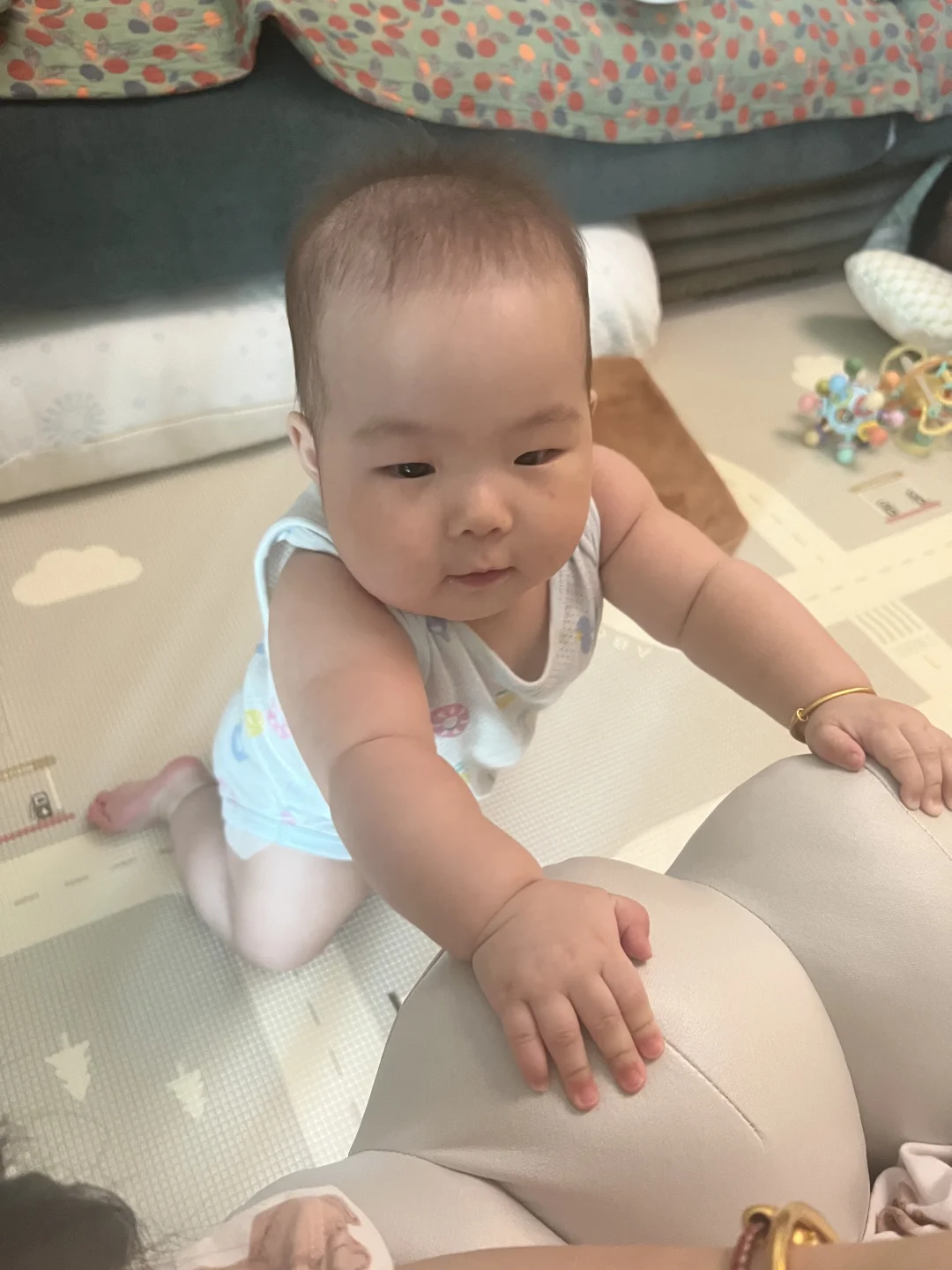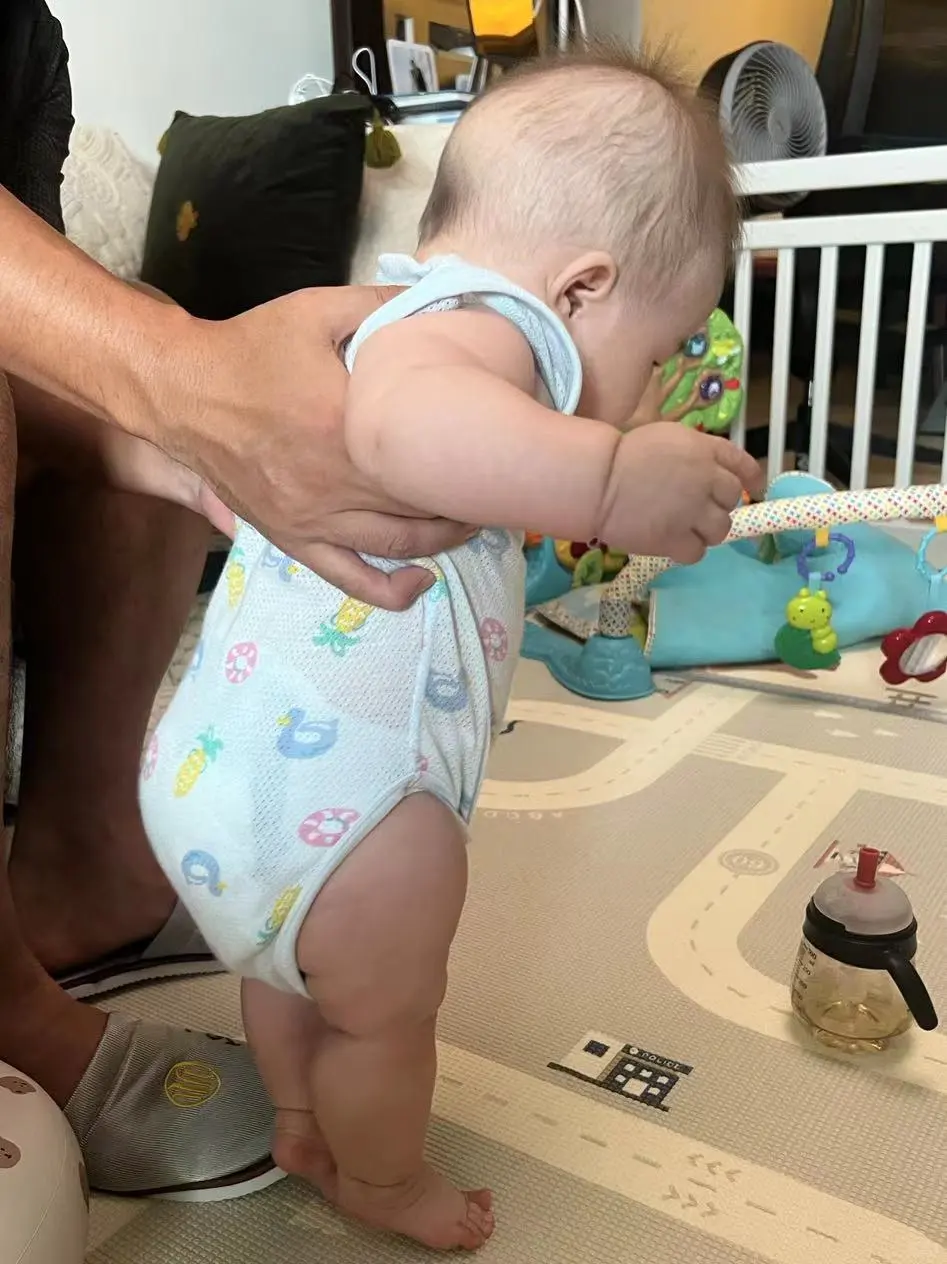 我家娃六个半月了,大运动发展良好,会爬,会左右翻身,会独坐,最近各种努力想站起来,但目前站不起来急的嗷嗷叫,老父亲助她一臂之力,顿时很开心。