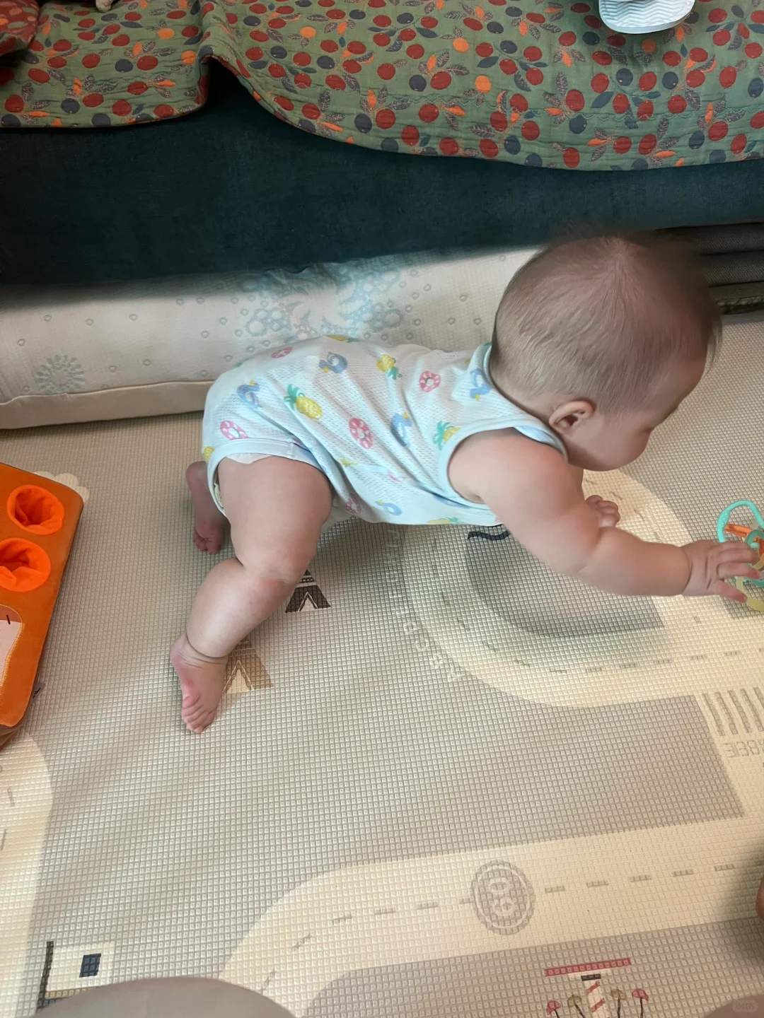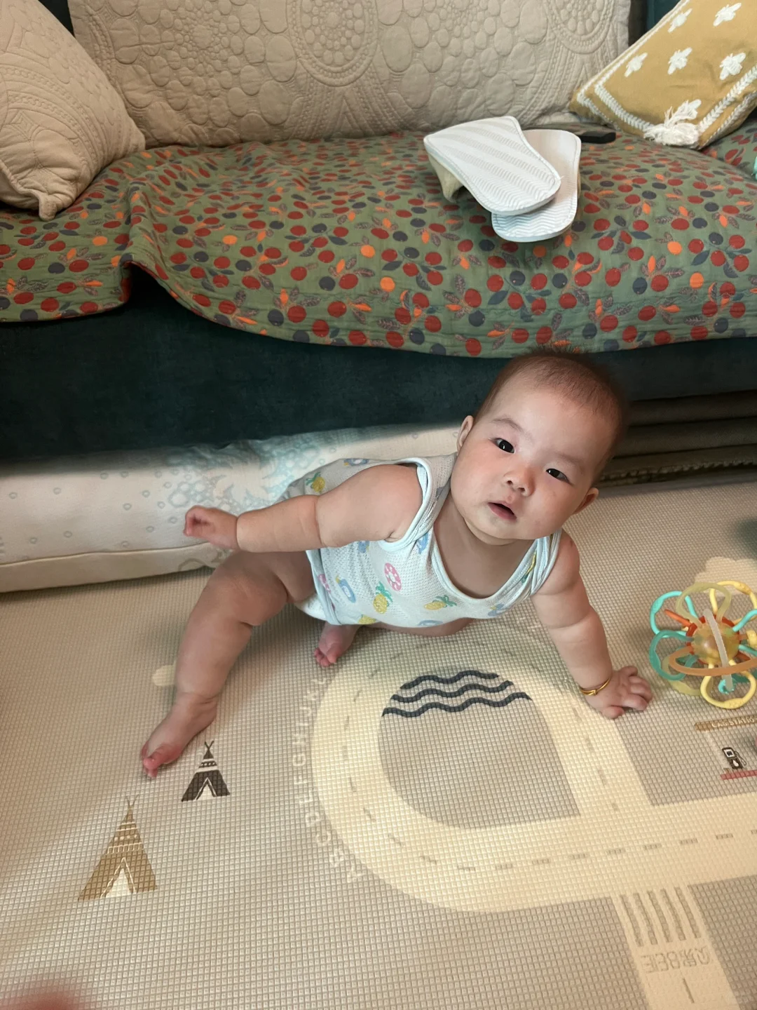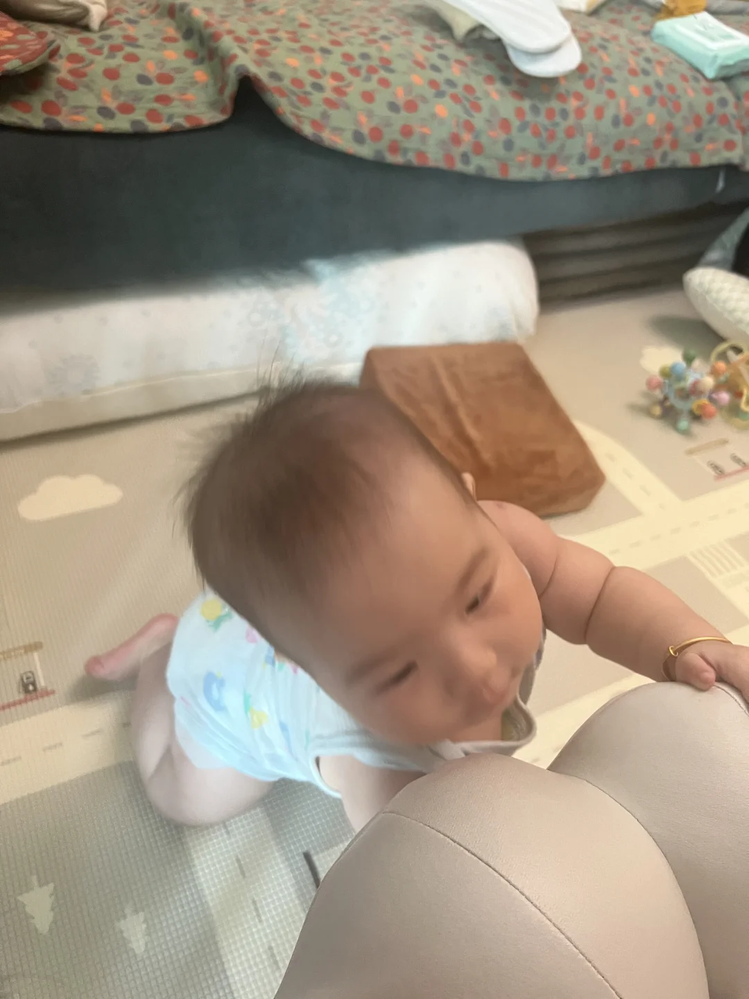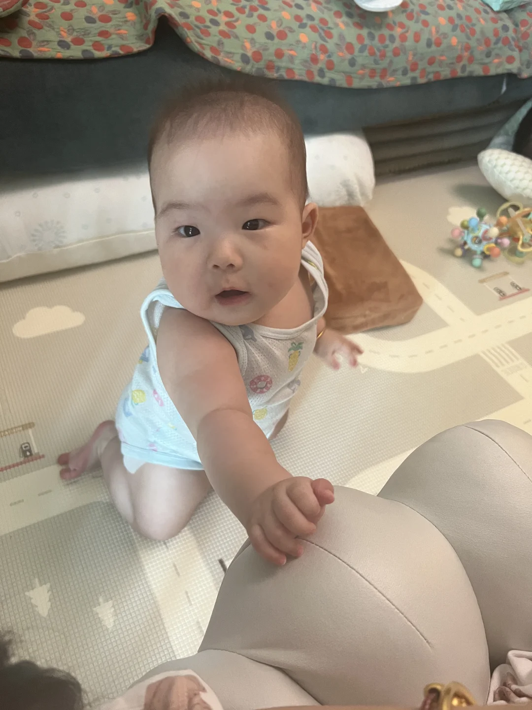 我家娃六个半月了,大运动发展良好,会爬,会左右翻身,会独坐,最近各种努力想站起来,但目前站不起来急的嗷嗷叫,老父亲助她一臂之力,顿时很开心。