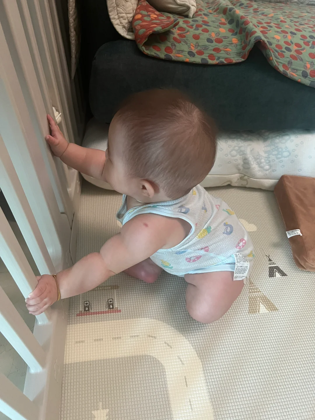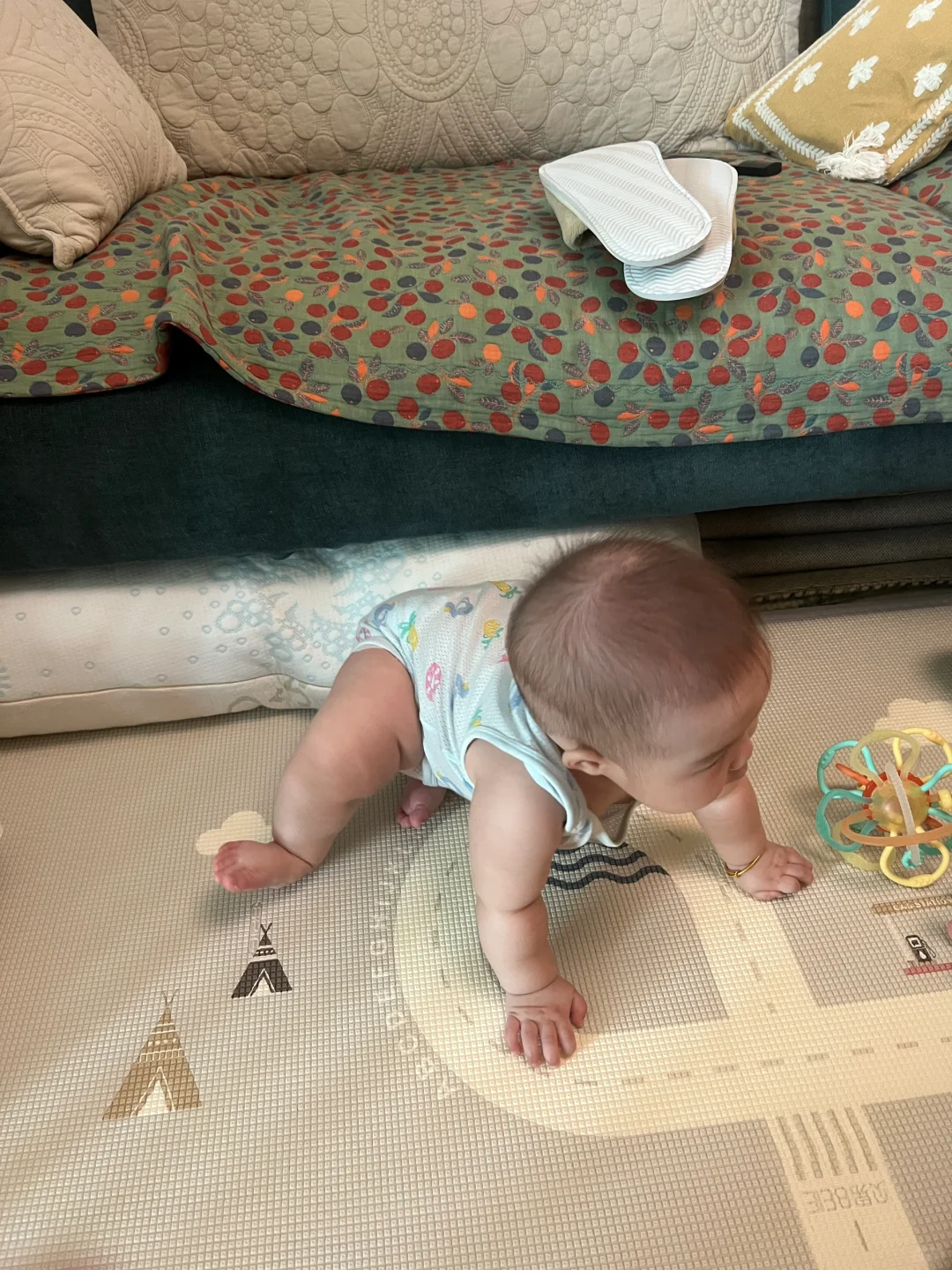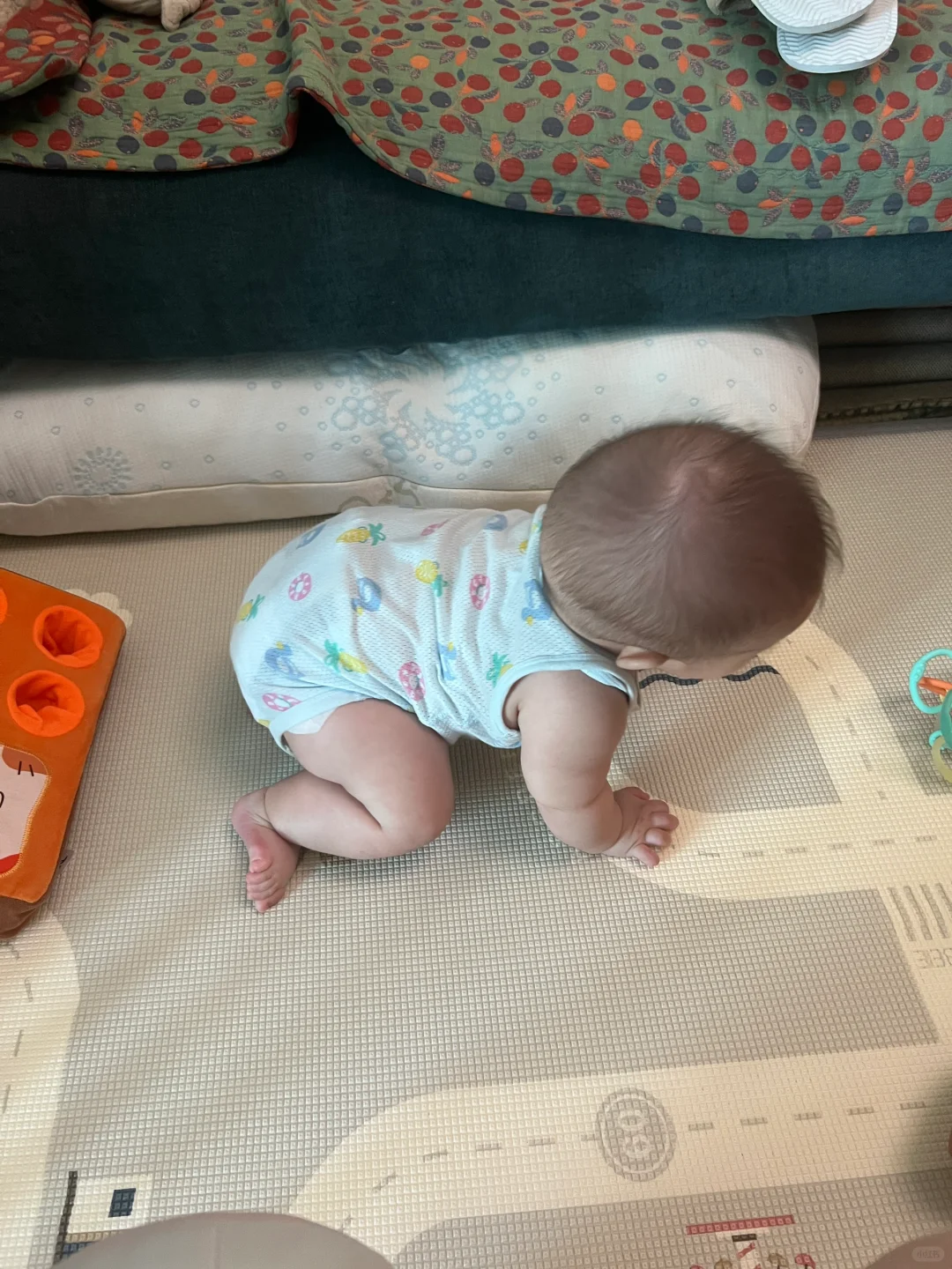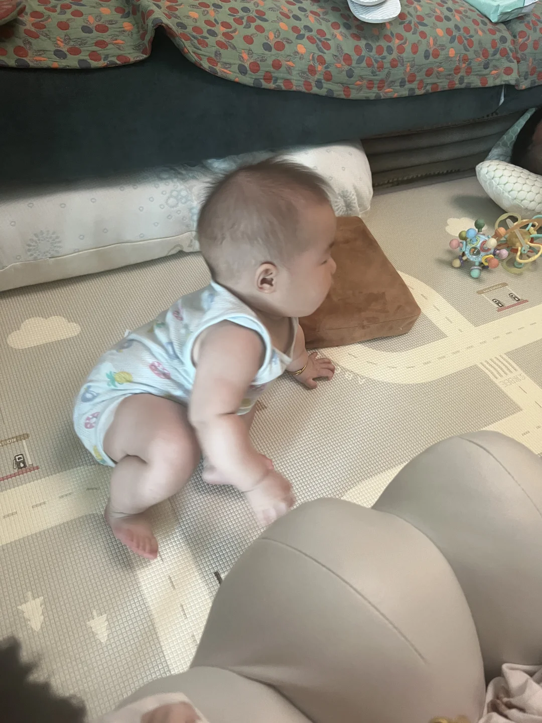 我家娃六个半月了,大运动发展良好,会爬,会左右翻身,会独坐,最近各种努力想站起来,但目前站不起来急的嗷嗷叫,老父亲助她一臂之力,顿时很开心。