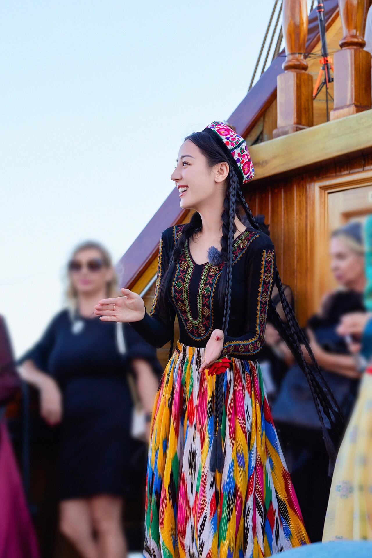 穿着艾特莱斯裙子的热巴,像一朵盛开的石榴 民族的,即世界的 穿着民族服饰,头上戴着小花帽在异国他乡旅游跳舞的热巴 美丽的像绽放的石榴花 她看着那样的耀眼与快乐