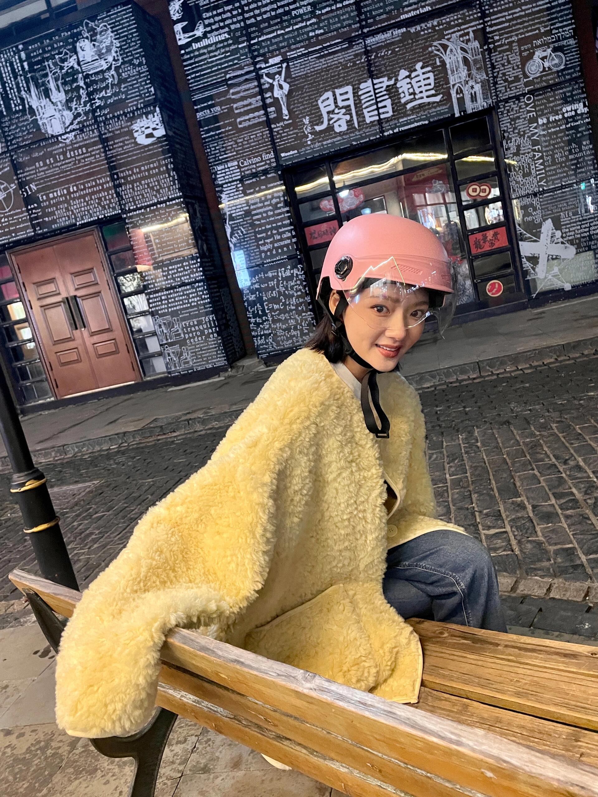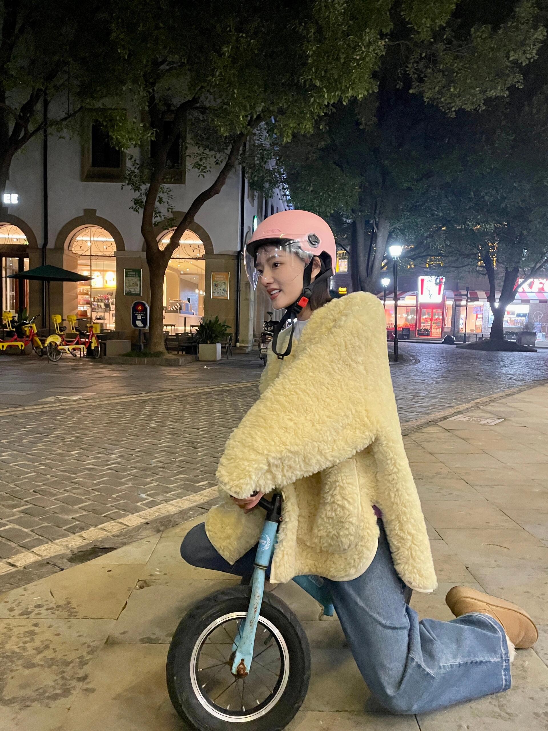 哎呀,任敏骑车的样子也太减龄了吧,奶黄外套加分,简直是街头一道亮丽的风景线~