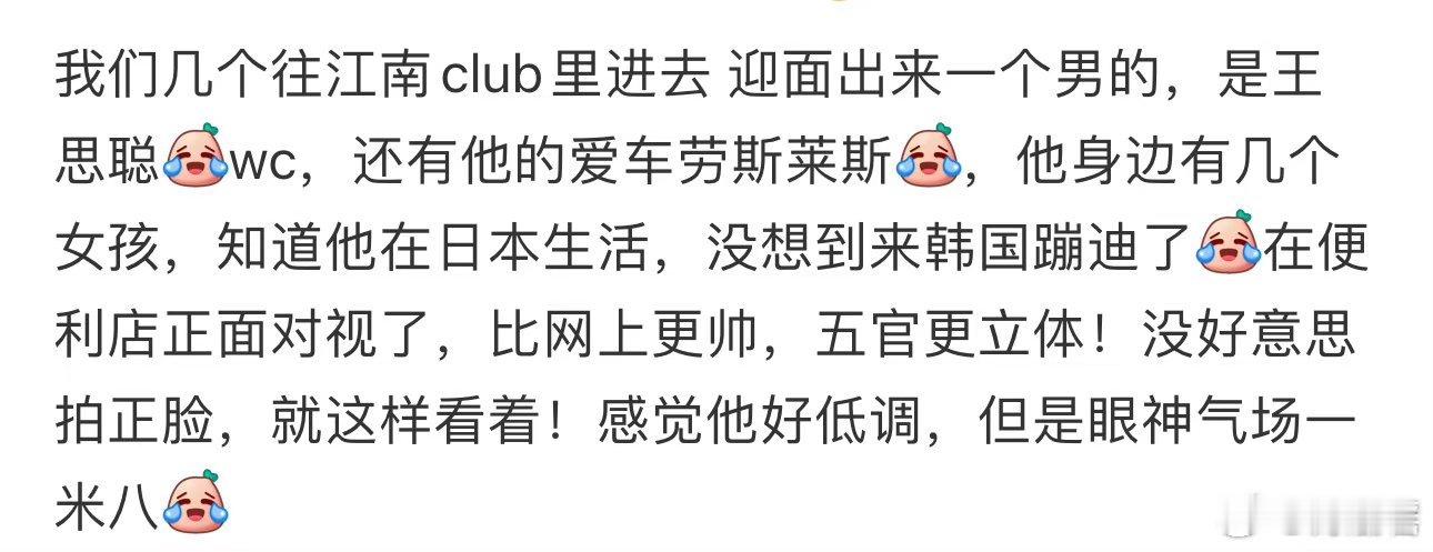 近日,有网友发文称,在韩国🇰🇷江南club偶遇王思聪和他的劳斯莱斯豪车🚘,王思聪的身边有几个年轻女孩👧和他一起蹦迪🕺🏻💃,他的右手紧紧牵着一个女孩👧的手👋不放松。