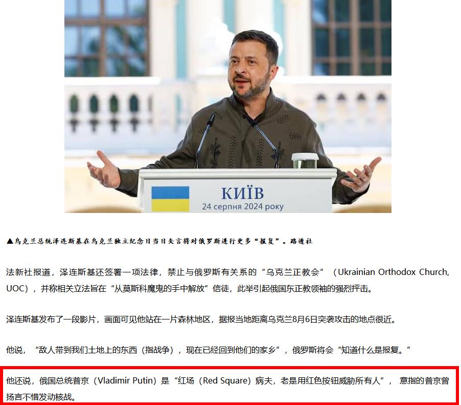 【泽连斯基蔑称普京“红场病夫”】8月24日是乌克兰独立日。乌总统泽连斯基在独立日