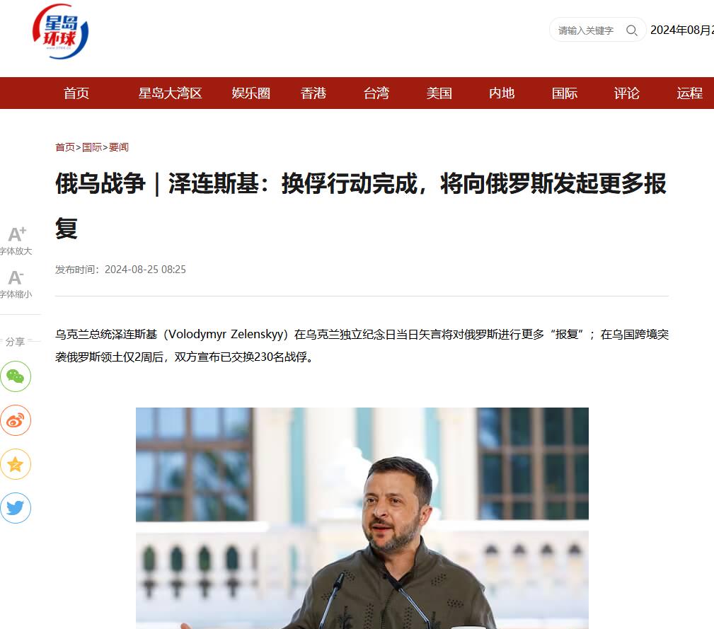 【泽连斯基蔑称普京“红场病夫”】8月24日是乌克兰独立日。乌总统泽连斯基在独立日发表视频讲话时说,俄罗斯总统普京是“红场病夫”,老是握着核武器的“红色按钮”威胁所有人。他说,乌克兰人绝不会被吓倒。他誓言,乌军还将对俄罗斯发动更猛烈的打击,直到俄军完全撤离乌克兰领土。