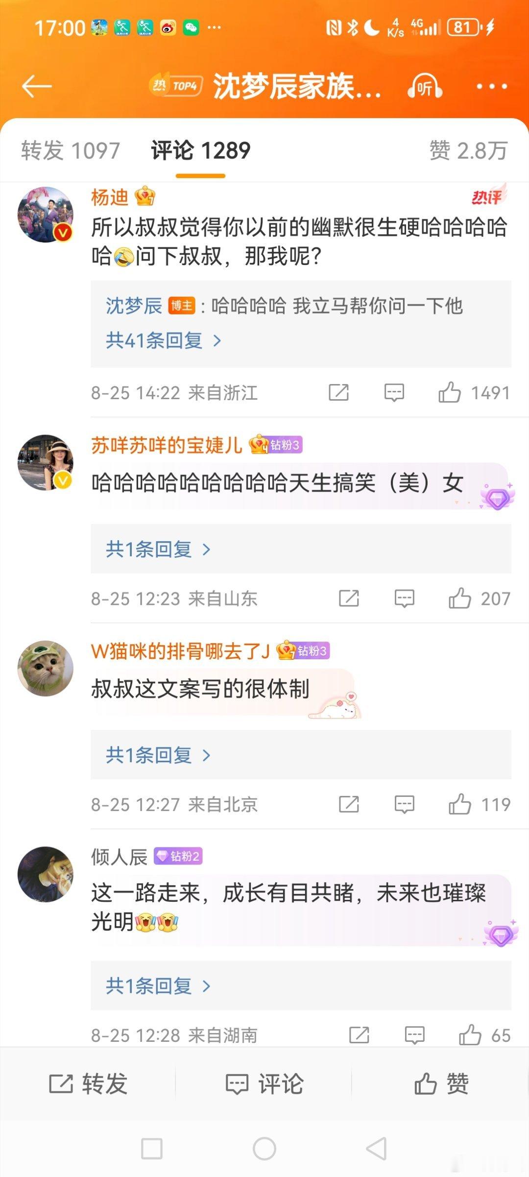 主持人在微博评论区留言调侃梦辰:“所以叔叔觉得你以前的幽默很生硬,哈哈哈哈哈🤣,问下叔叔,那我呢?”