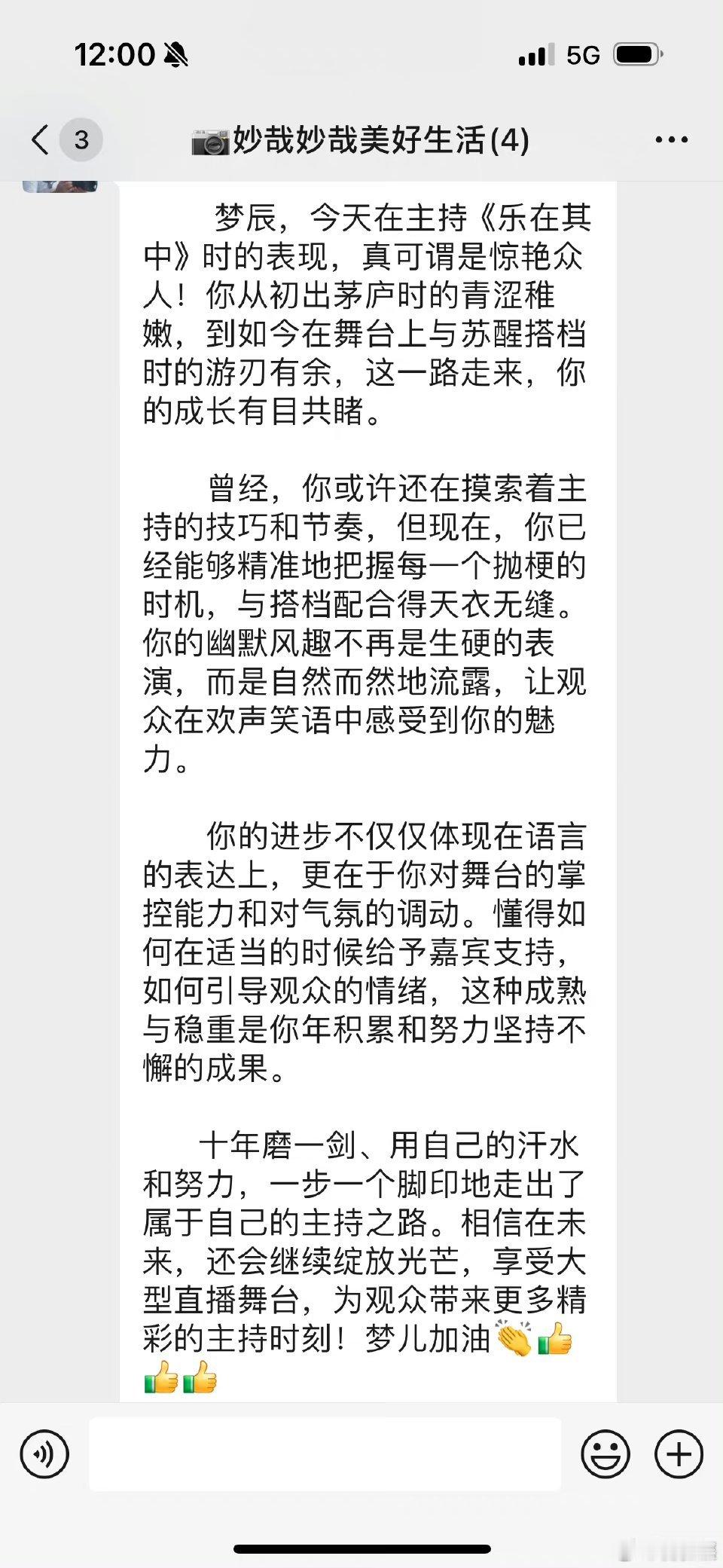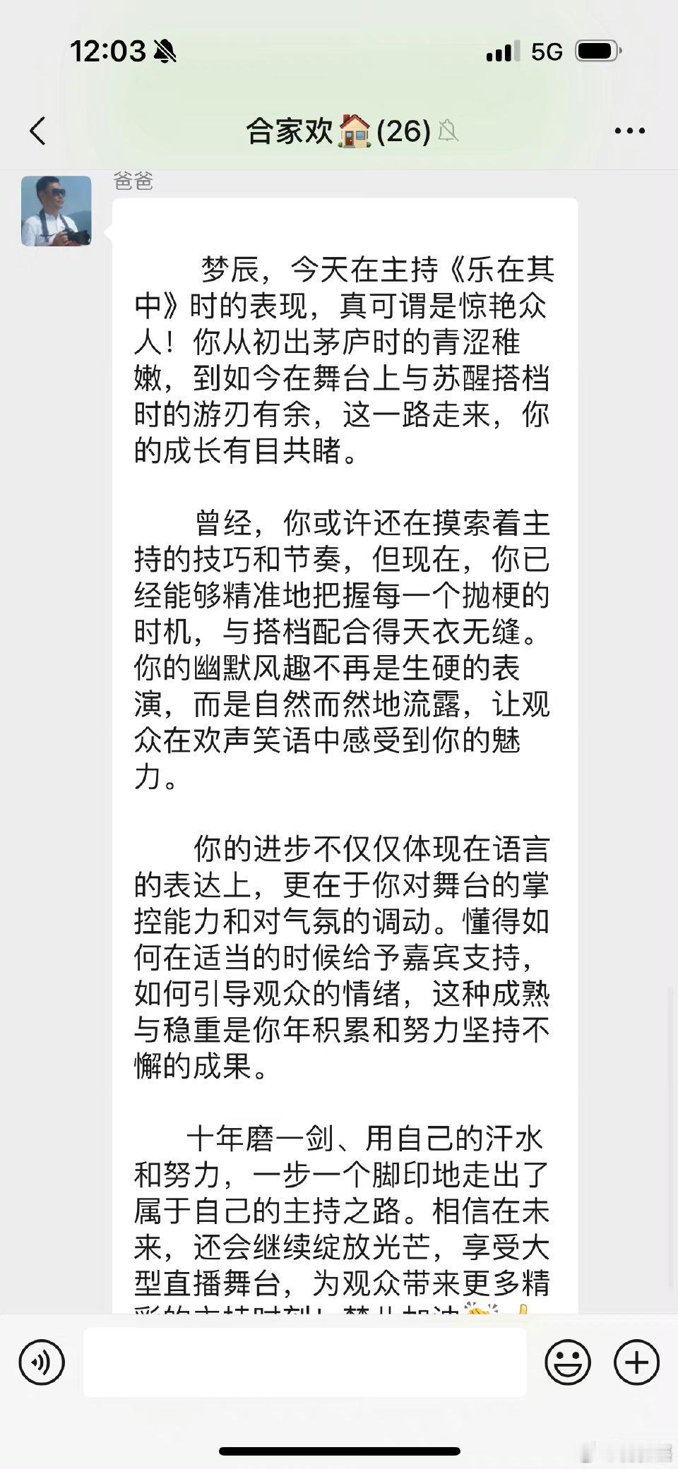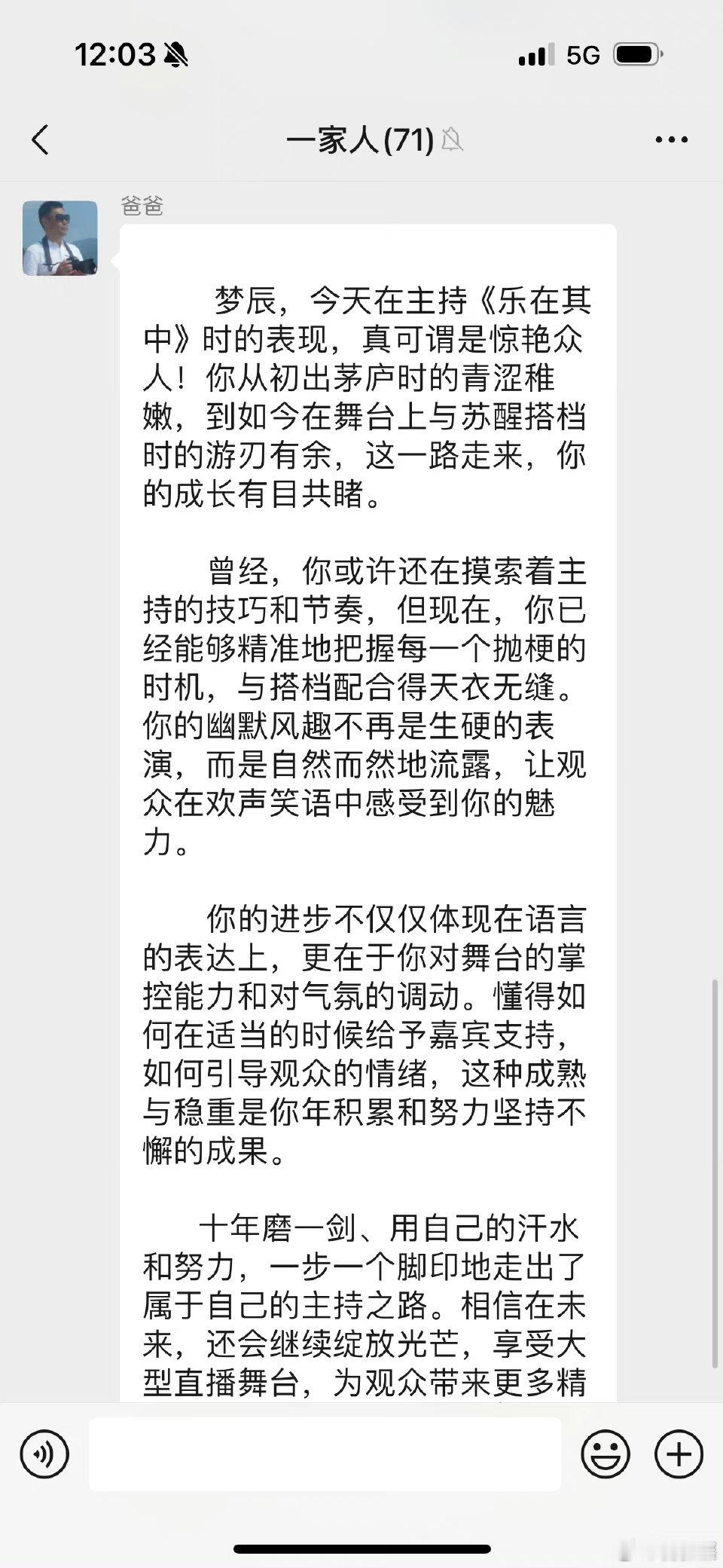 8月25日中午,湖南卫视著名主持人发博晒出父亲夸奖她的长文,并配文:“来自父亲的肯定,且每个家族群都要发一遍,比我还想证明自己的父亲,但中间这句我不接受,'你的幽默风趣不再是生硬的表演',我一直都觉得我的幽默是骨子里的。”
