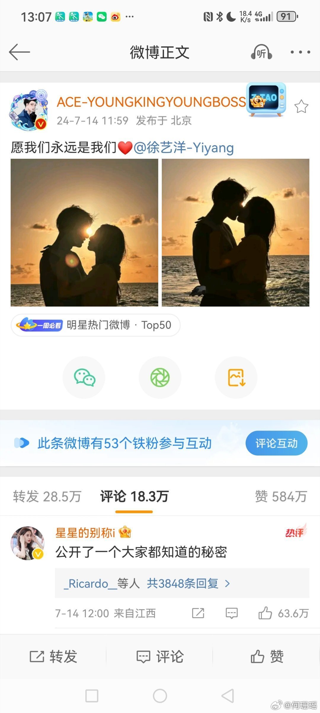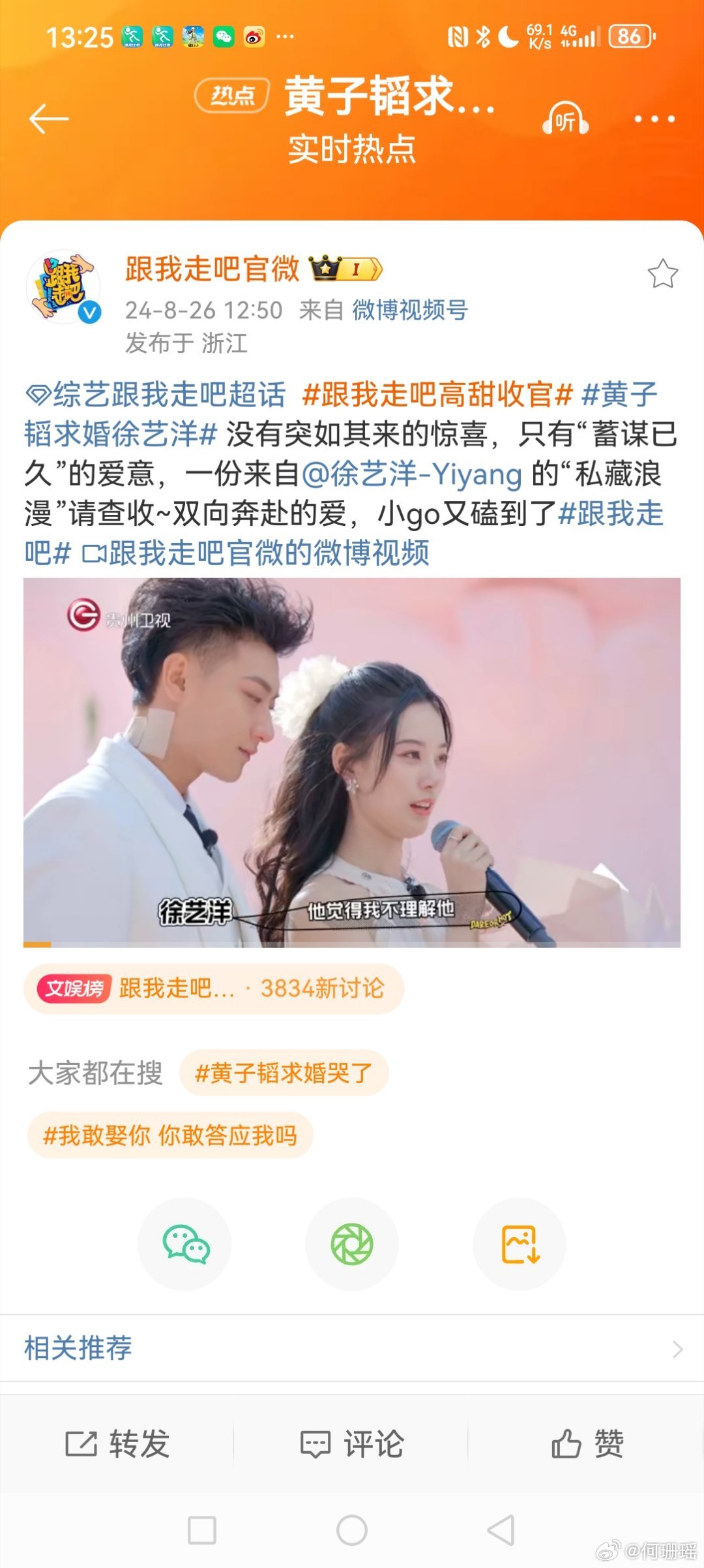 7月14日,黄子韬发博晒图官宣恋情,近日直接向徐艺洋求婚。