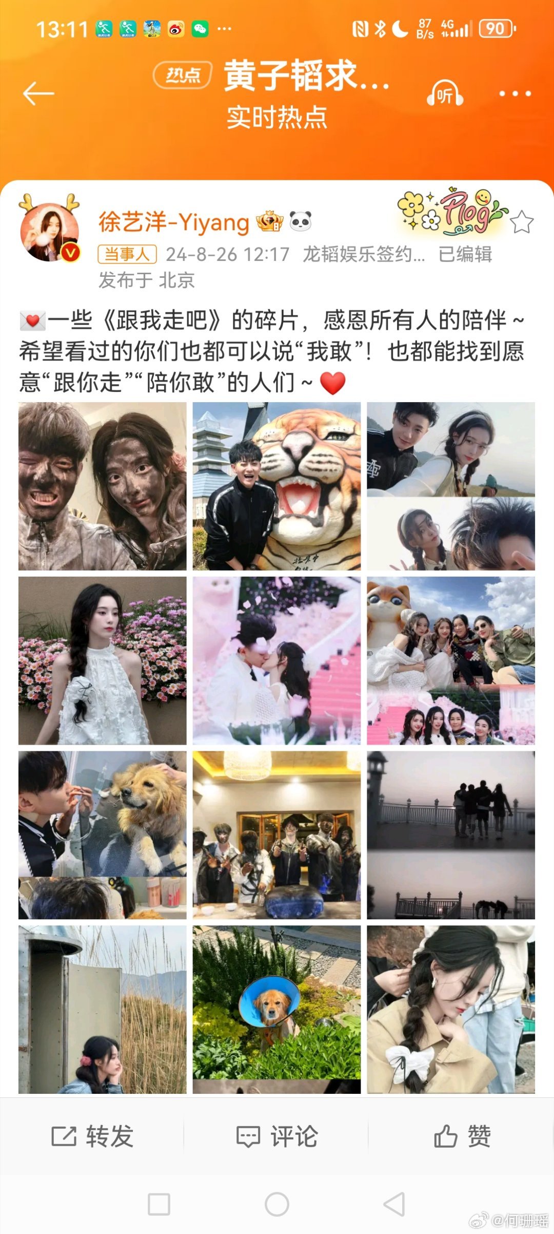 8月26日中午,发博晒图并配文:“🩷一些《跟我走吧》的碎片,感恩所有人的陪伴~希望看过的你们也都可以说'我敢!'也能找到愿意'跟你走''陪你敢'的人们🩷”