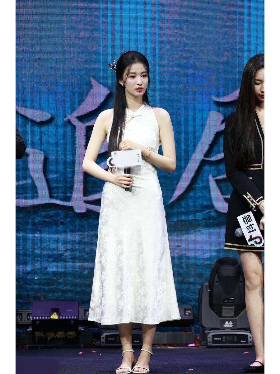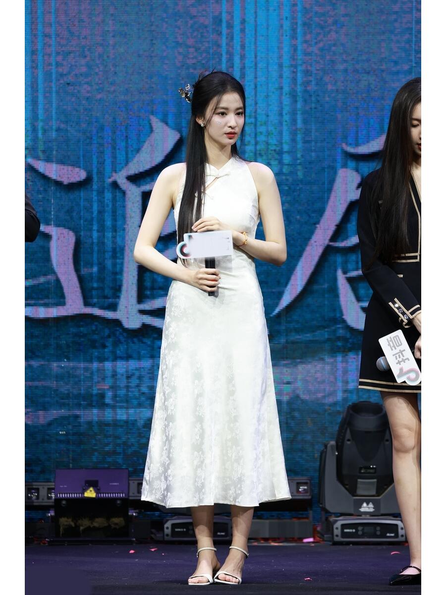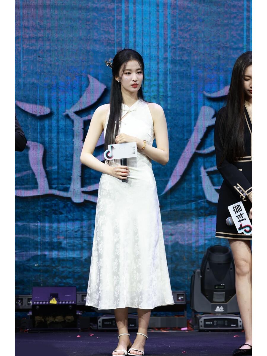 王楚然穿的这白色旗袍很美,优雅复古 王楚然美图,她一件白色的无袖连衣裙,这裙子是一条改良的旗袍,不高的小立领,斜襟的无袖A字旗袍裙,长度过了膝盖。大气复古又有现代感,很不错的新中式风格。旗袍的颜色也不错,白色本色提花的缎纹面料,简洁高级。这种A字形的旗袍裙对身材要求没有那么高,也比较透气。日常穿也是不错的。