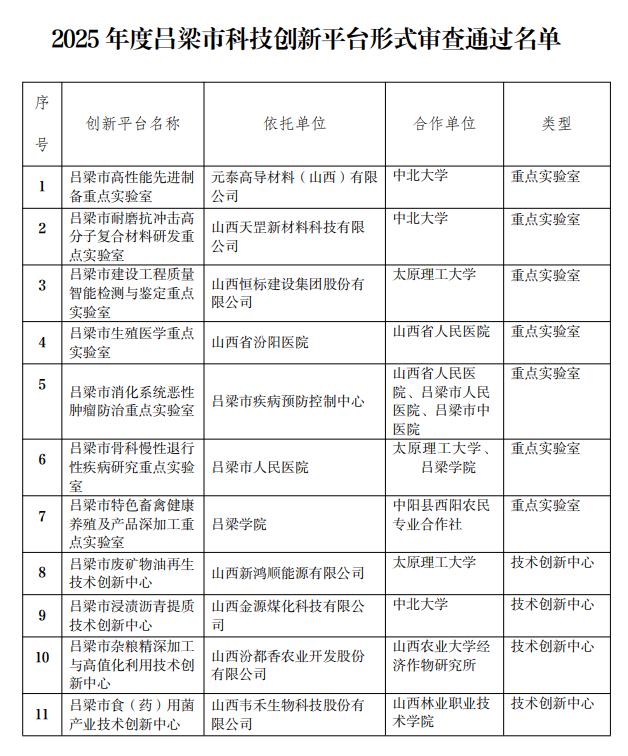 近日,吕梁市科技局发布2025年度科技创新平台形式审查结果公示,15项重点实验室、技术创新中心申报项目中,11项通过形式初审拟获受理。这批覆盖新材料、医疗健康、现代农业、资源循环等领域的创新平台,精准对接吕梁“985”重点产业链建设需求,为山西资源型城市转型注入科技动能。