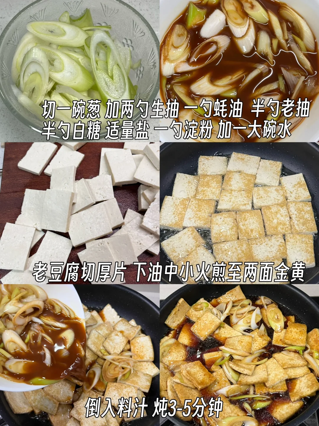🌟做法: 1️⃣切一碗葱,放两勺生抽、一勺蚝油、半勺老抽、适量盐、半勺白糖、一勺淀粉,一大碗水 2️⃣老豆腐切厚片,中小火油煎至两面金黄,倒入料汁,炖煮3-5分钟✅ -