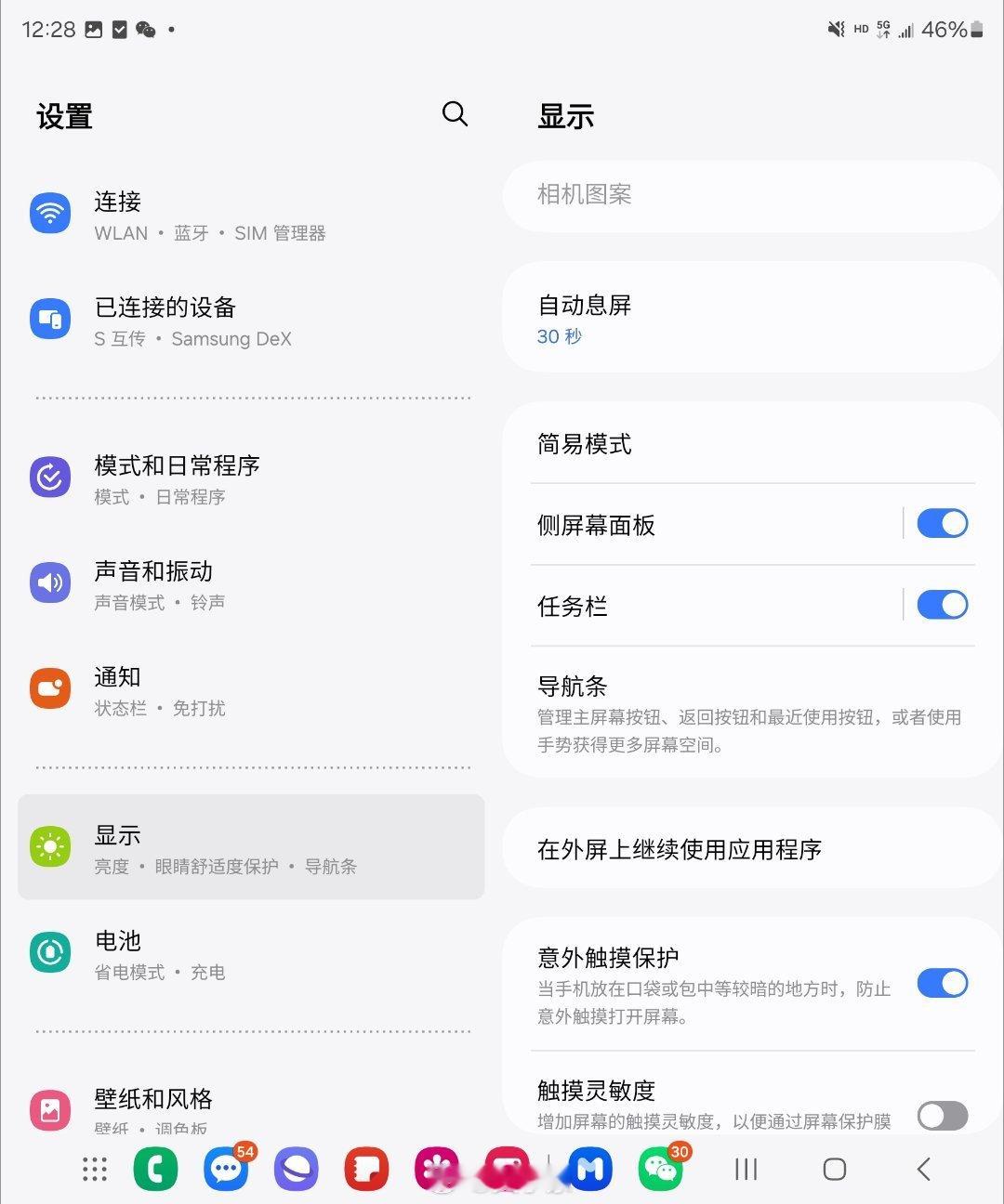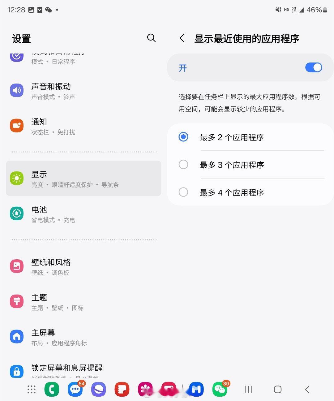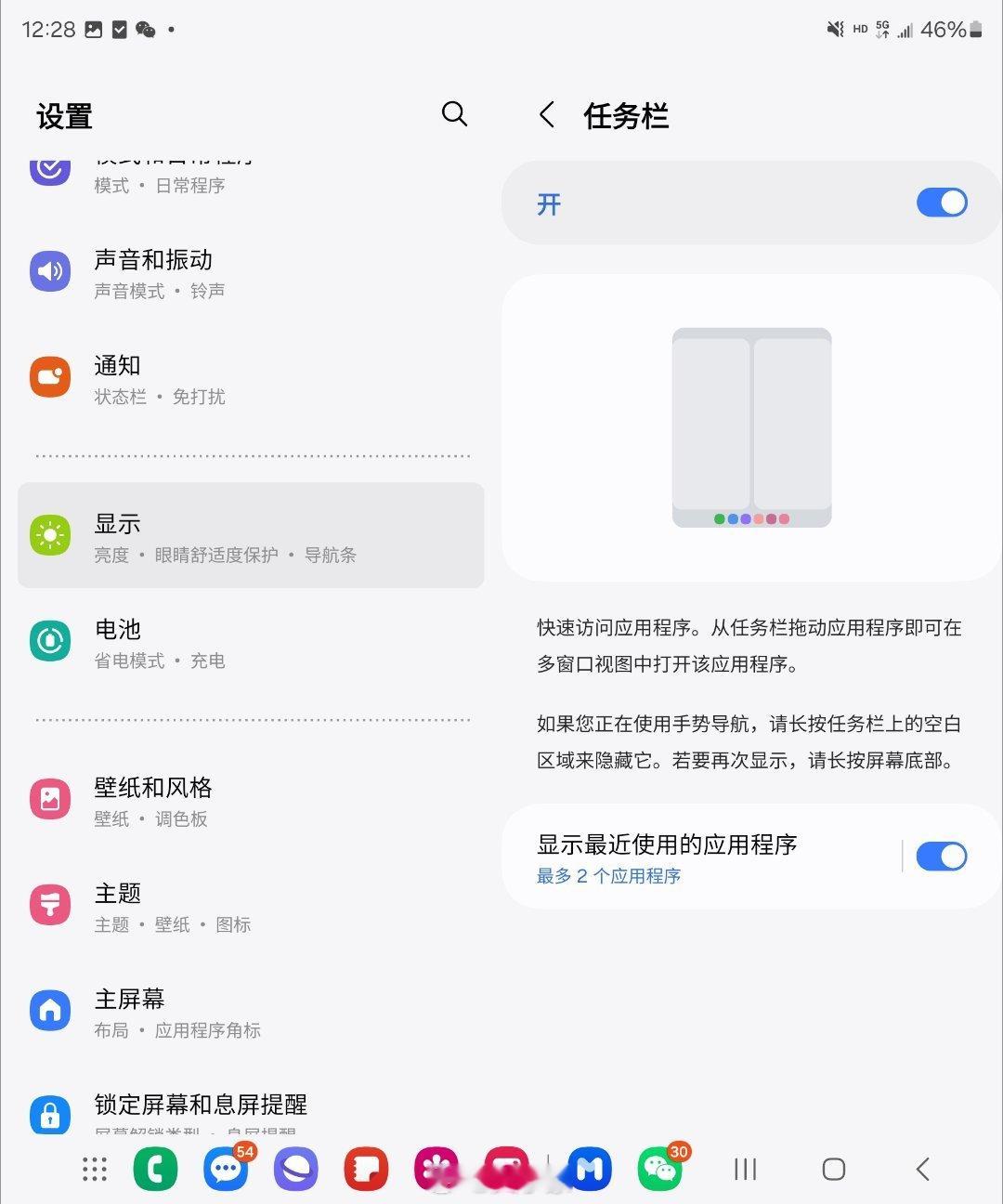 现在每天使用手机时,非常需要快速找到某个应用,三星大屏手机有个类似电脑的功能,底部任务栏,在【设置】-【显示】-【任务栏】中将其打开,就能得到主页面中一个完美的底部任务栏,还能根据自己的使用习惯自定义自己想要放在底部任务栏的软件。