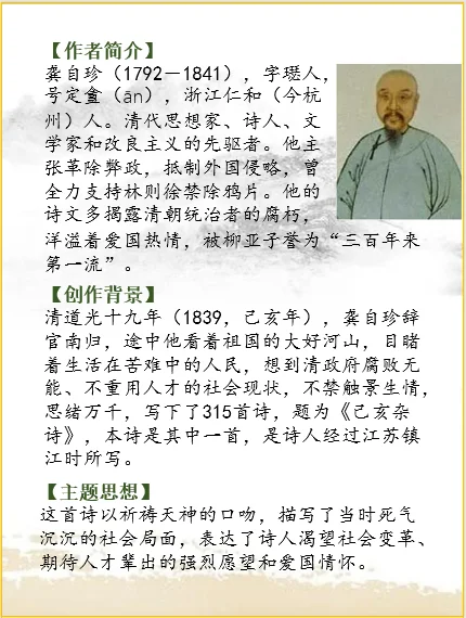 清道光十九年(1839,己亥年),龚自珍辞官南归,途中他看着祖国的大好河山,目睹着生活在苦难中的人民,想到清政府腐败无能、不重用人才的社会现状,不禁触景生情,思绪万千,写下了315首诗,题为《己亥杂诗》,本诗是其中一首,是诗人经过江苏镇江时所写。