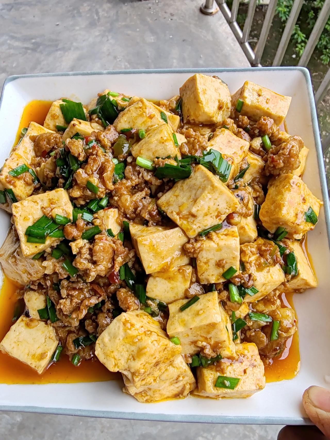 分享一张你拍的美食照片儿子爱吃的烂肉豆腐,上桌啦,把绞成肉粒的猪肉放上豆瓣酱,酱油,姜蒜放在锅里一起爆香,然后掺点山泉水,烧开后放入打成小块的豆腐,煮上几分钟,倒入芡汁滴几滴花椒油撒少许鸡精,放上刚从地里摘回来的韭菜,翻匀后起锅搞定。