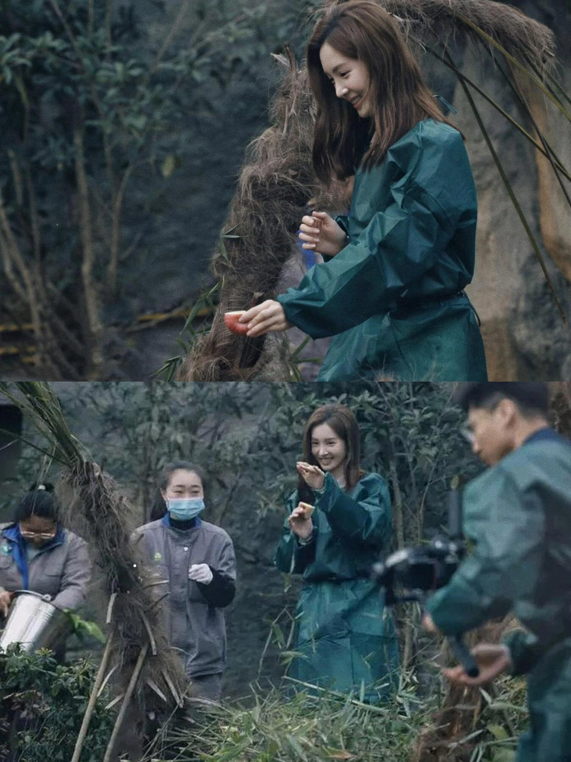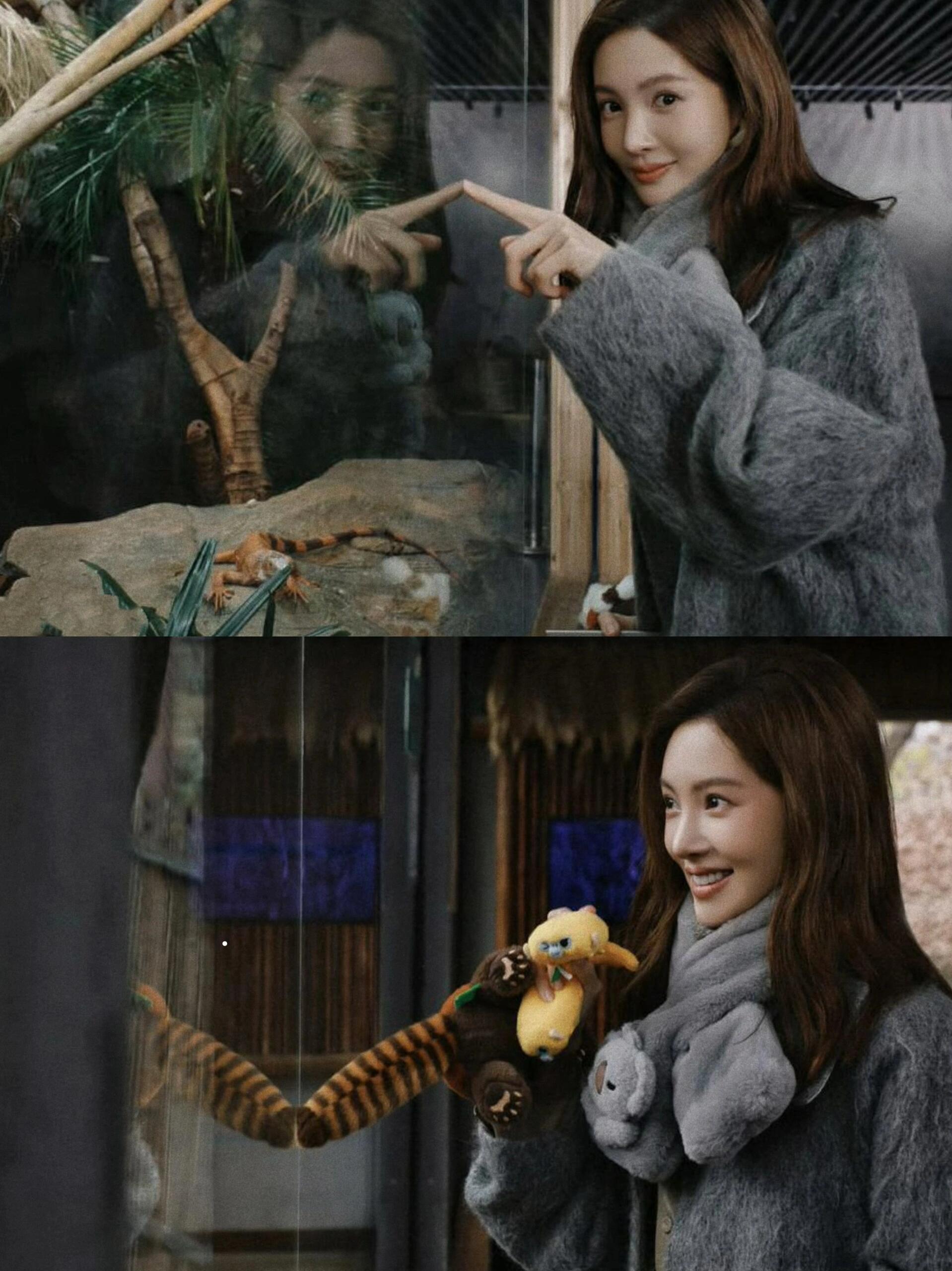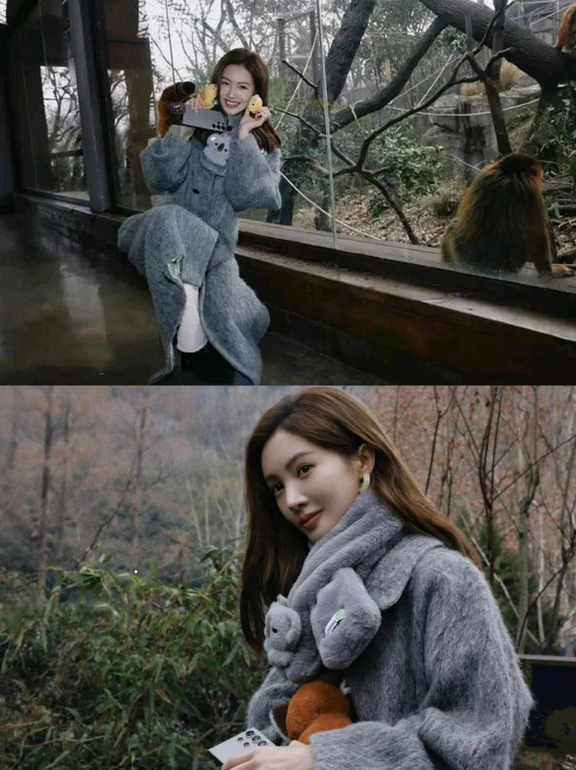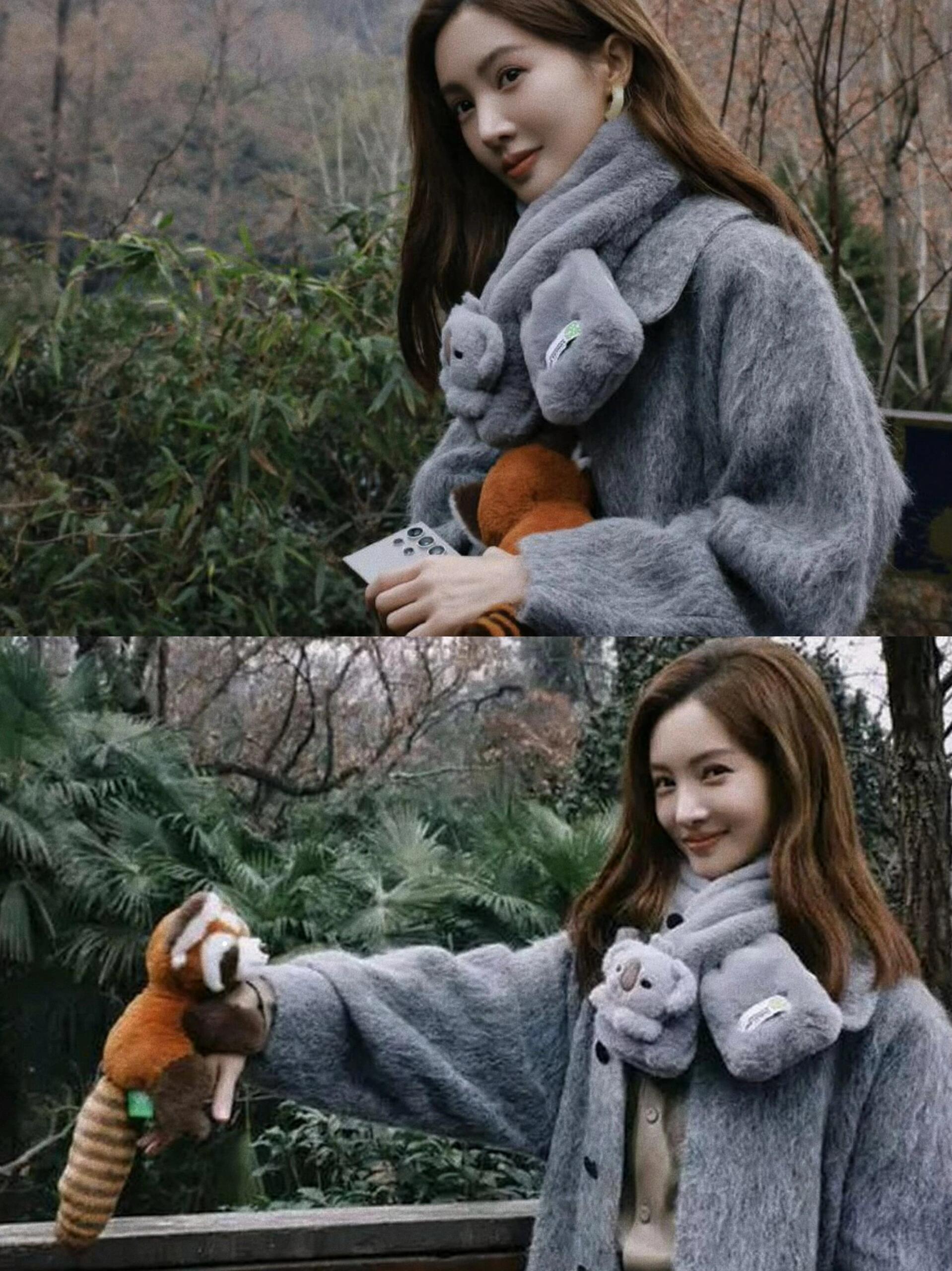 金晨一袭灰色长款大衣高级感十足,白色高腰长裤尽显窈窕身材,各种小动物玩偶加身可爱满分。