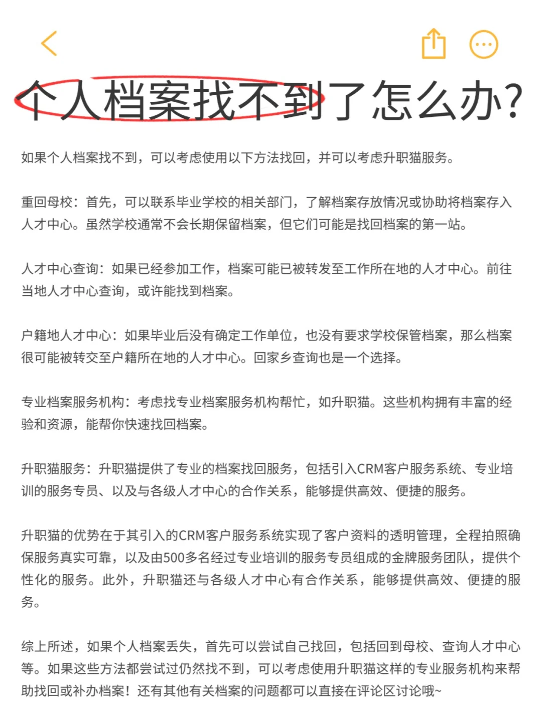 如果个人档案找不到,可以考虑使用以下方法找回,并可以考虑升职猫服务。