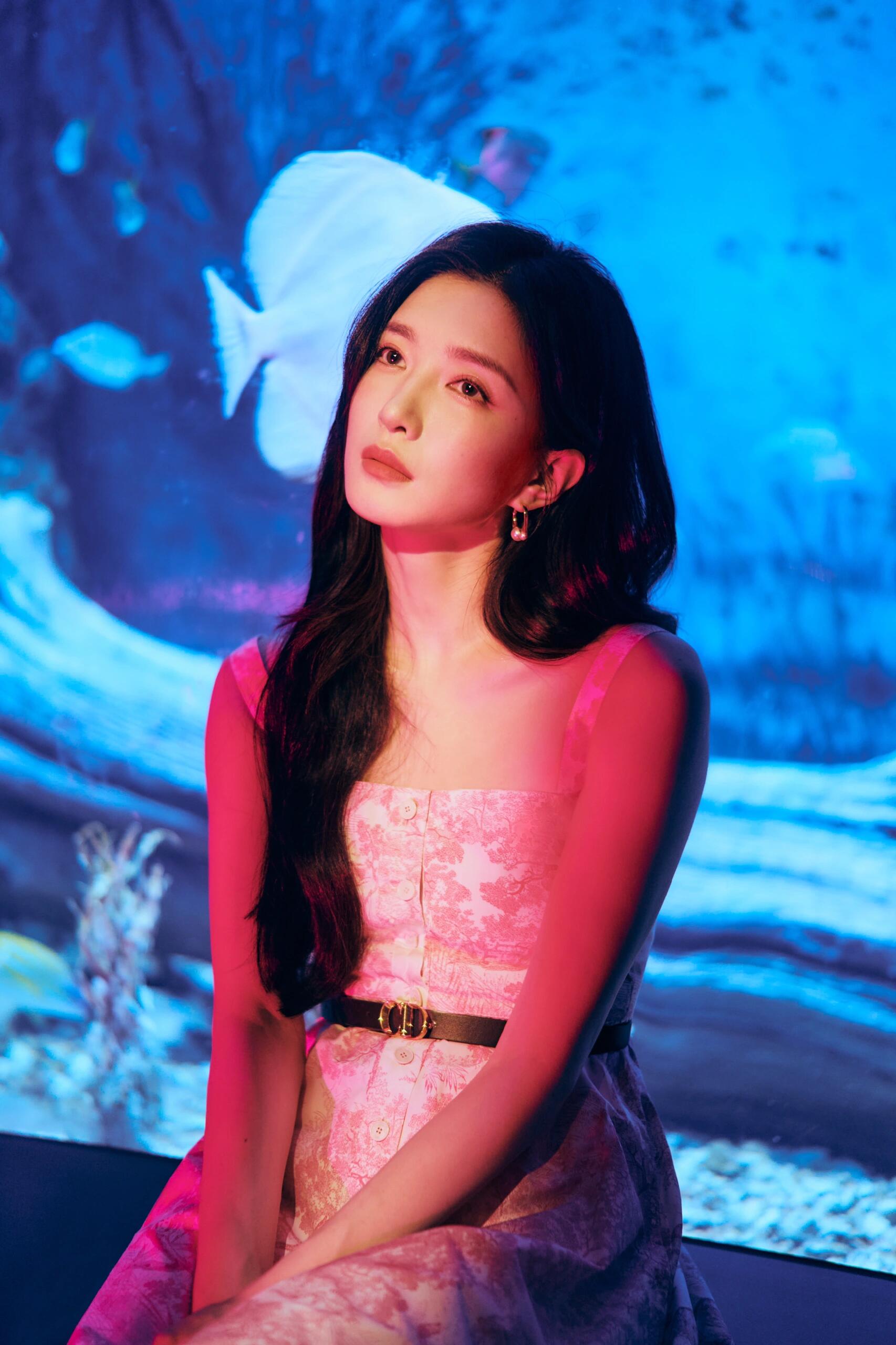 江疏影身穿粉色吊带长裙,赤脚立于水族馆中,身材高挑,宛如水族馆里的美人鱼!