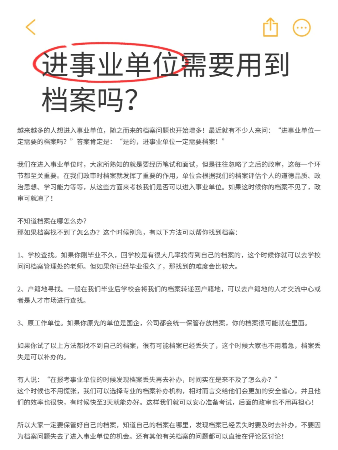 所以大家一定要保管好自己的档案,知道自己的档案在哪里,发现档案已经丢失时要及时去补办,不要因为档案问题失去了进入事业单位的机会。还有其他有关档案的问题都可以直接在评论区讨论!